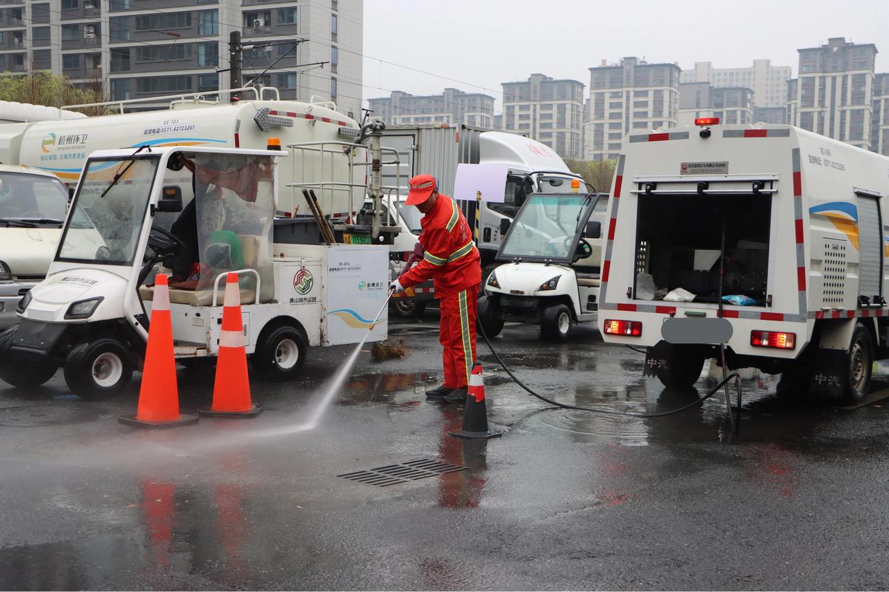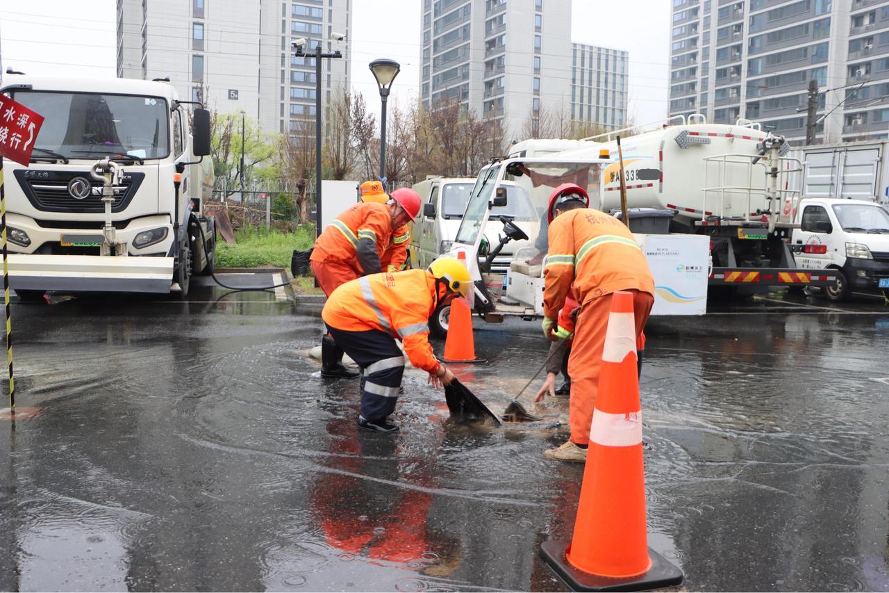 本次演练紧贴汛期环卫作业实际,全流程模拟特大暴雨引发道路低洼路段积水、窨井堵塞的高频突发场景。演练中,巡查组发现汛情后第一时间上报积水点位信息,同步在现场设置警戒、引导行人车辆绕行;应急救援领导小组立即启动应急预案,统筹调度抢险救援、物资保障等各小组,携专业设备与抢险物资火速赶赴现场。抢险人员规范设置作业警示区域,针对不同积水深度采取分类处置措施,高效完成排涝作业,后续同步跟进路面积泥积淤清理保洁,严防管道再次堵塞。