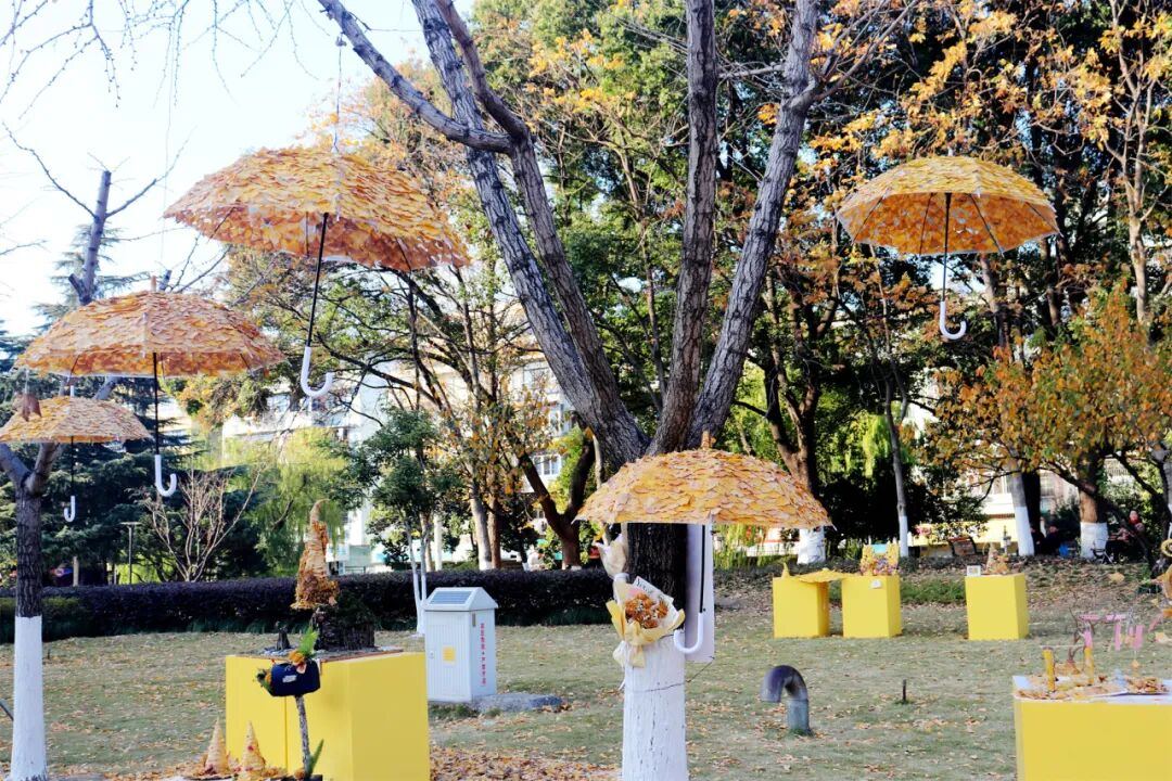 城河公园里,拾起“金箔”的年轻人们用巧手打造了“金叶奇想”银杏艺术展。魔法帽、团扇、叶雕猫…寻常银杏叶被赋予二次生命,变身精美艺术品。这场展览,展现出了无限创意与青春温度。