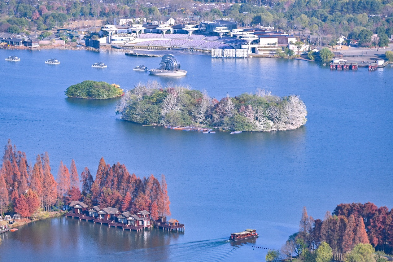冬日湘湖的碧水间,一幅双重奇景正缓缓铺展:湖心无人岛上,千余只黑颈鸬鹚集群栖息,竟造就出一片宛若“白雪”覆岛的别致景观;岸边落羽杉、池杉、水杉、中山杉连片成林,叶片由浅橙晕染至赤褐,像无数燃烧的火炬刺破天际,勾勒出独属于寒冬的热烈色彩盛宴。