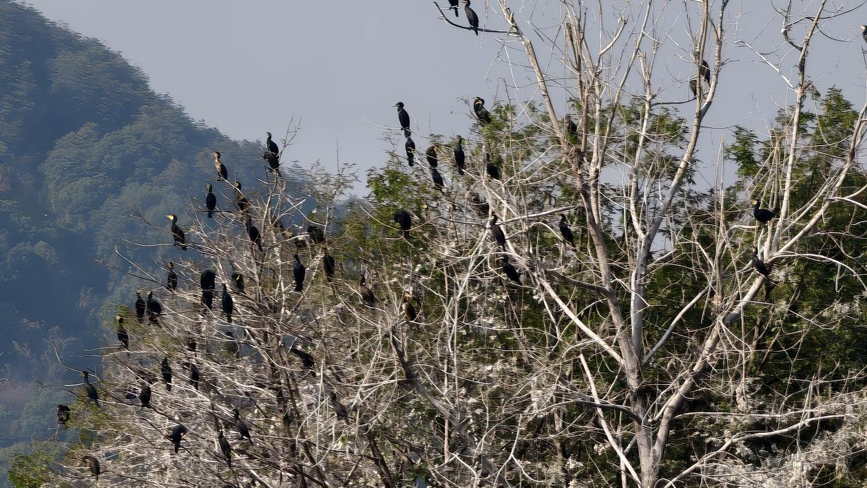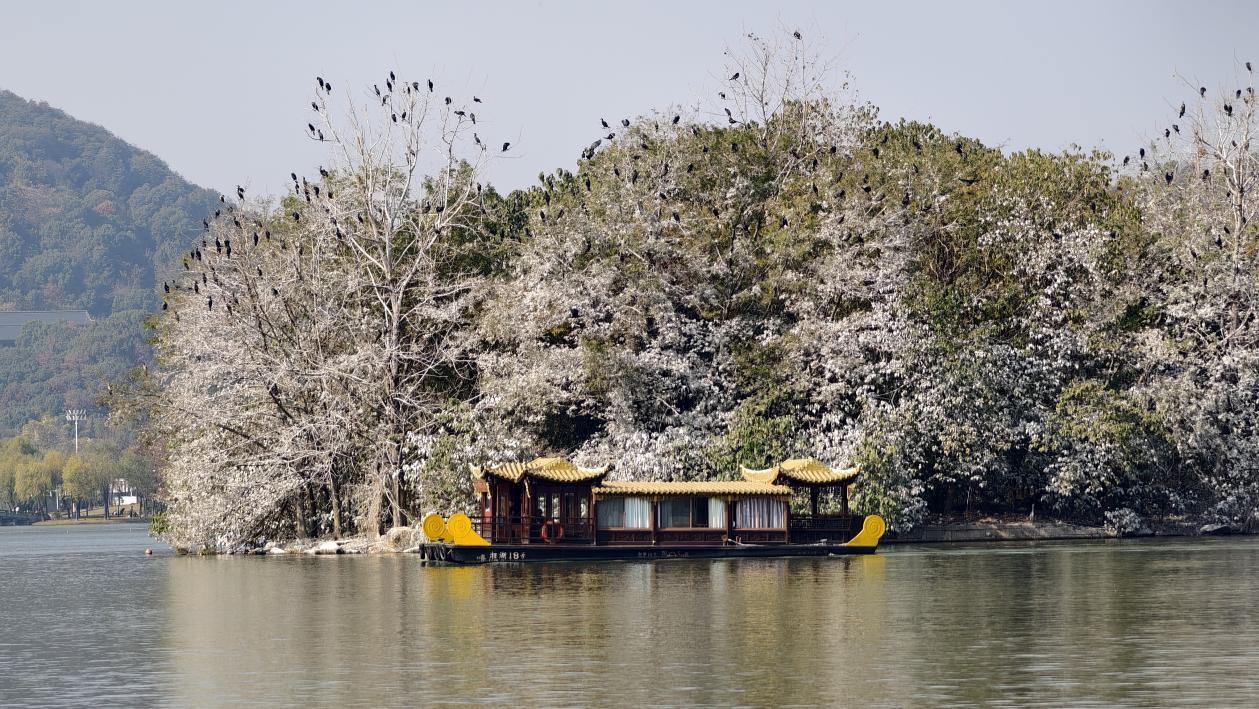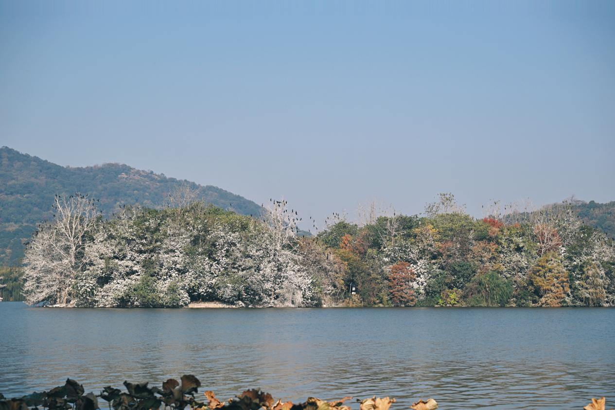 “你看,单单这张照片里的鸬鹚就数不清,更别提这满岛都是,得有上千只呢。”凑近看,原来是这座无人岛上,千余只鸬鹚在这里觅食、栖息,排泄物日积月累,便将沿岛树木的枝丫染成一片“白雪”,成为湘湖独一份的“生态奇观”。