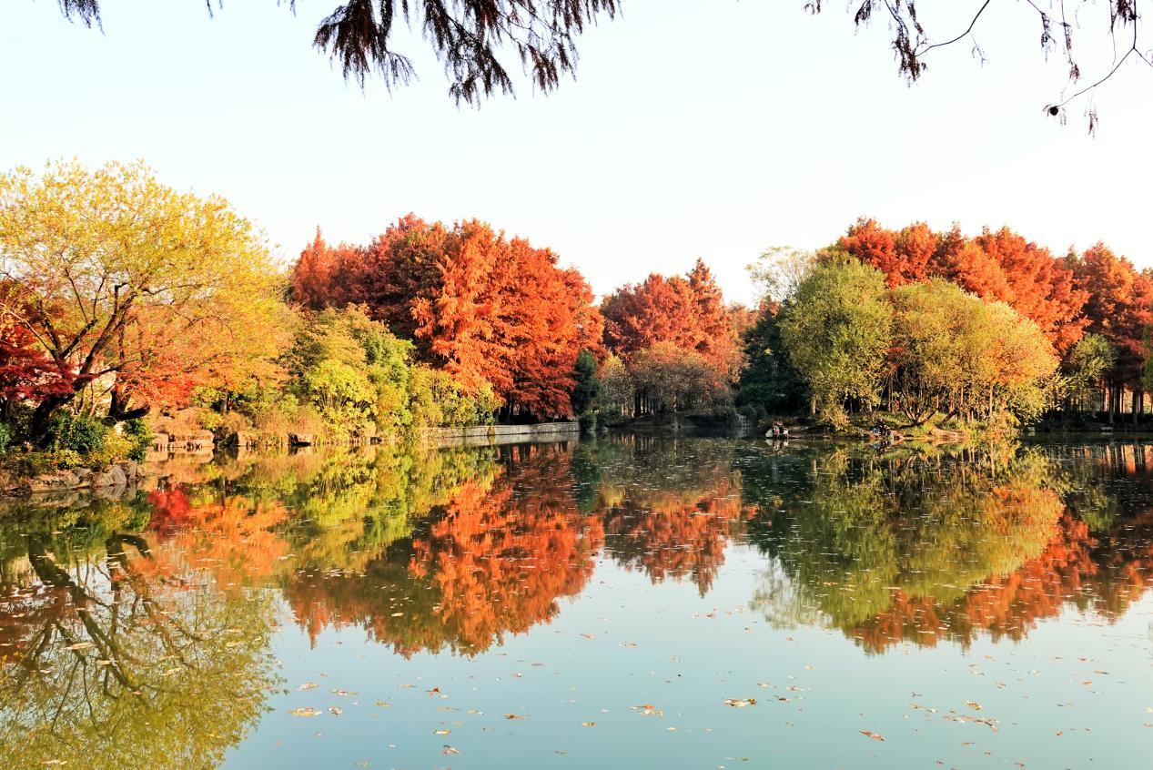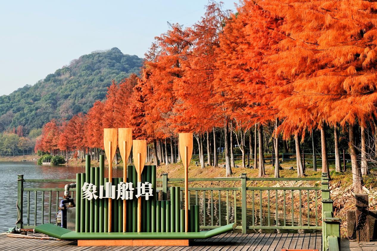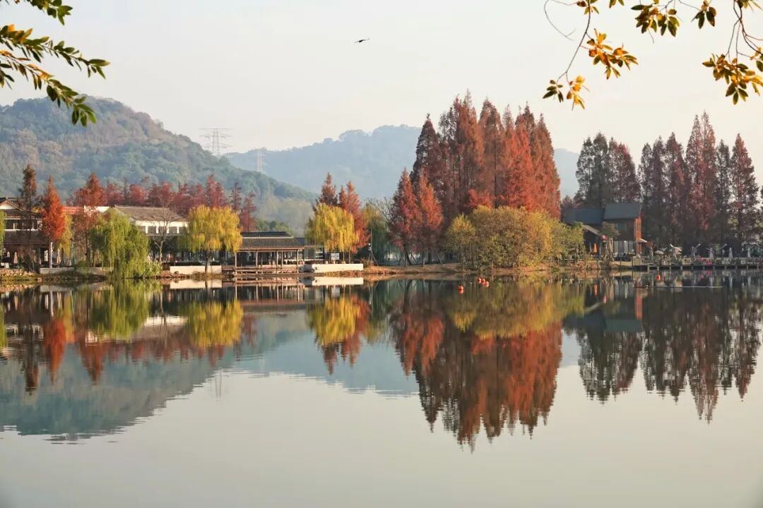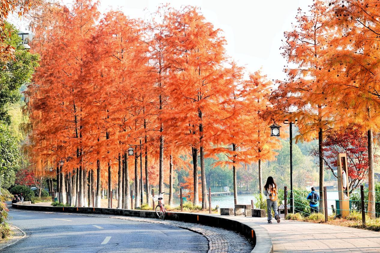 时值冬日,湘湖的红杉林迎来最佳观赏期。定山广场的层林尽染,湖山广场的灵动纯粹,越王路老虎洞路段的壮阔绚烂,让这片“西湖姊妹湖”再度成为网红打卡地。沿着越王路漫步,70亩水杉林如仪仗队般整齐排列,连山桥停车场对面的湖畔,水杉倒映水中,将湖面分割成色彩斑斓的宝石。络绎不绝的游客穿梭其间,快门声此起彼伏。“去年冬天看到明星来湘湖拍戏,就在一片红杉林里,我就种草了,今年特地踩着点来拍照。”游客小顾在小红书上刷到湘湖的水杉林,便立即买了高铁票从宁波过来。为了拍出最美红杉林照片,他准备在湘湖拍摄三天。“我很喜欢这里,以前只觉得水杉美,这两天在湘湖逛,还有很多鸟类,生态很好。”