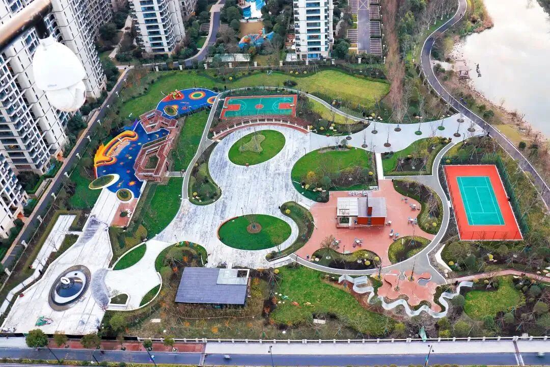 作为萧山区城市公园绿地开放共享试点公园,江南公园通过功能复合、空间融合,成功打造了一处全龄友好、亲水见绿的公共空间。园内篮球场、网球场等运动场地经过翻新,更加平整安全;绿荫下的健身跑道、休闲座椅,为居民提供了丰富的户外活动选择。