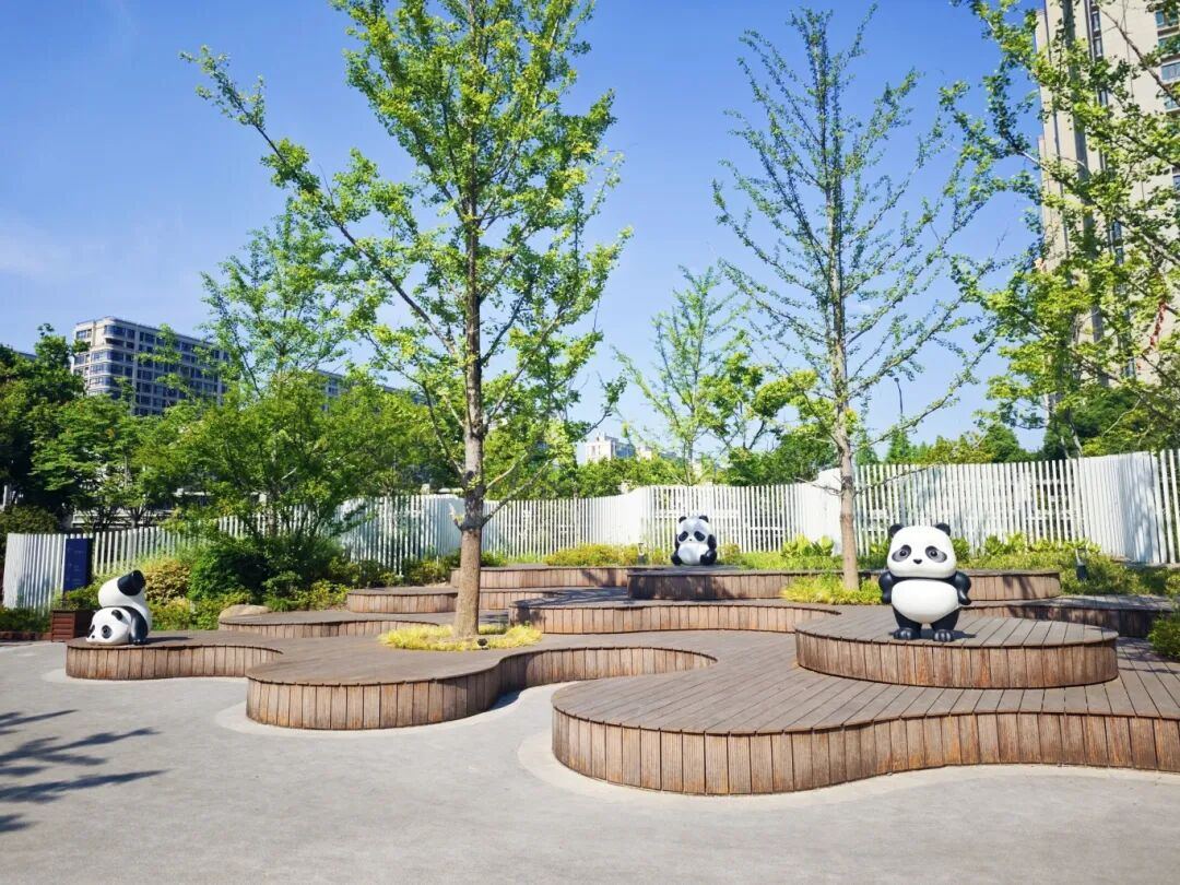 公园内设有亲子活动区、教育体验区,将亲水、生态与趣味学习融为一体。孩子们可以在儿童涂鸦墙上自由创作,在悬挂着树木名牌的植物间开启自然研学之旅,还可以在熊猫元素点缀的游乐区奔跑嬉戏。卡通熊猫座椅、多巴胺色系秋千、乐享童趣足球场……每一处细节都体现着对儿童的关爱与尊重,也让亲子互动在绿水环绕中更加温馨。