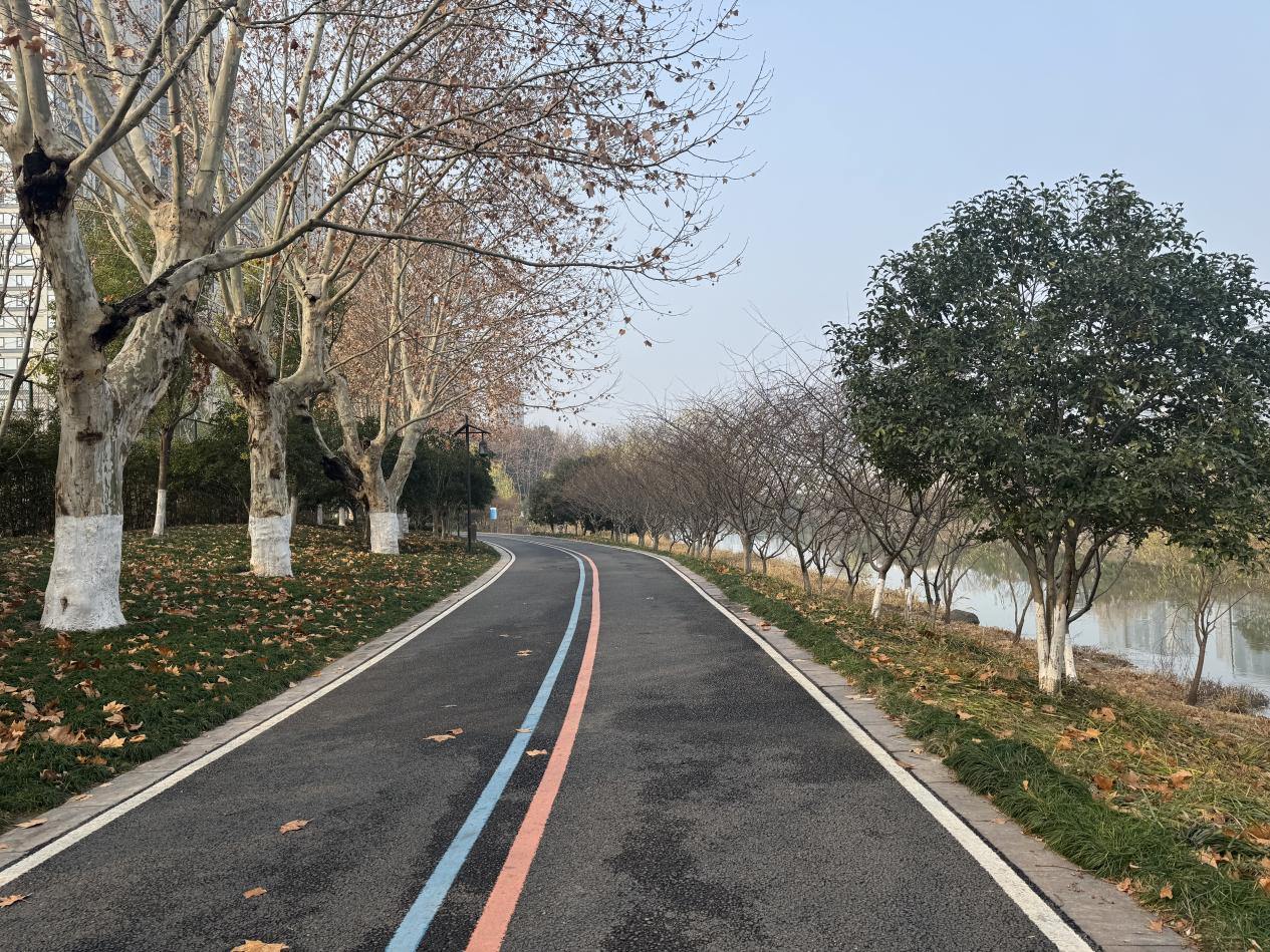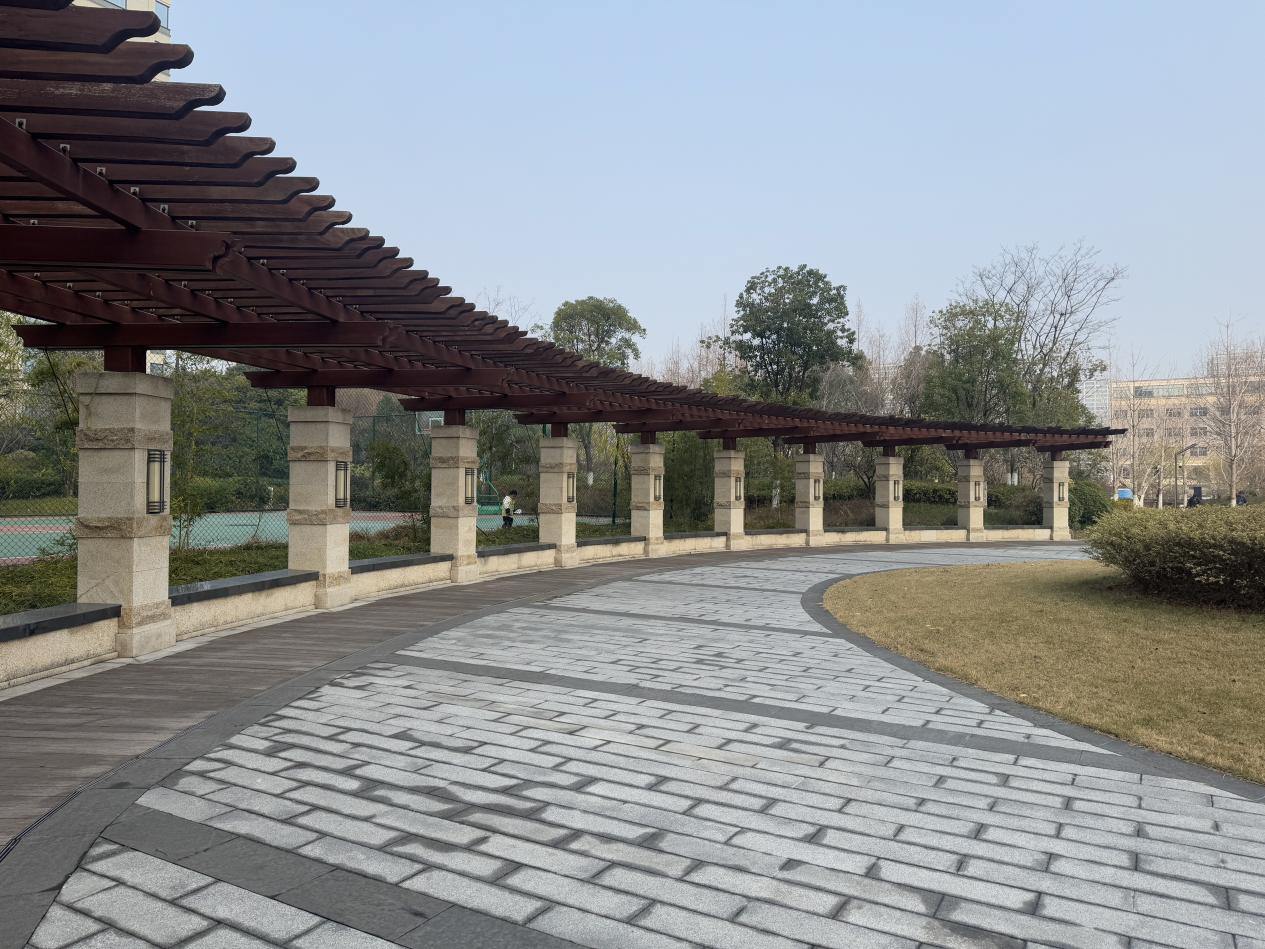 作为萧山区2022年建成的6个社区公园之一,江南公园从建设初期就注重与周边水环境的联动。园内绿植参照自然山水风格布局,樱花、茶梅等植物错落有致,与北塘河两岸的绿化带相互呼应。雨花石游步道、生态石游步道及无障碍坡道等设施,将游客缓缓引向水边,实现“园中有水意,水畔有园趣”。