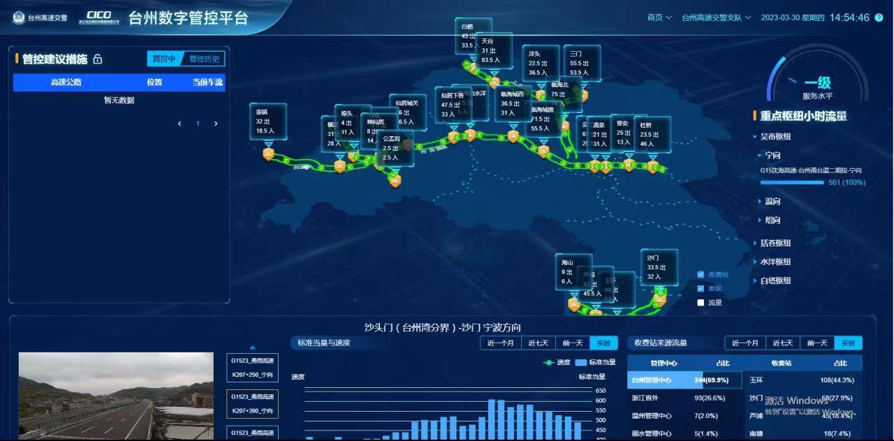 通过该平台联调,借助高速智能管控平台路网流量实时预测、管控策略一体配置、道路事件精准画像、通行数据全量分析、重点车辆智能监管等功能,交警部门实时监测台州中心辖区全路网主要路段、节点车型、流量等路况信息,并根据交通流变化统筹协调各业务条线资源,实时优化调整交通管控措施,由以往的“拥堵产生—被动接警—人工经验决策--指令下达”“粗放式”道路管控模式,向“精准预测制定方案—动态监测—大数据模型分析决策--下达指令”“精智化”新模式转变,达到预警、决策等可实施性强的综合治理方案,提升道路通行能力和服务水平。