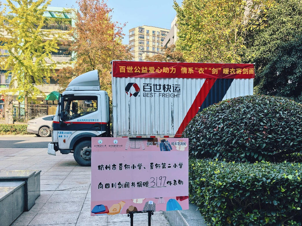 浙江在线11月26日讯 近日,杭州市夏衍小学、夏衍第二小学举办的以“情系‘衣’剑,暖衣寄剑阁”为主题的爱心冬衣捐赠活动圆满落幕。由两所小学师生们捐赠的 3197 件冬衣,在百世公益的爱心承运下,跨越近1800千里,顺利送至四川省广元市剑阁县的两所小学,为当地孩子送去冬日里的温暖与关怀。