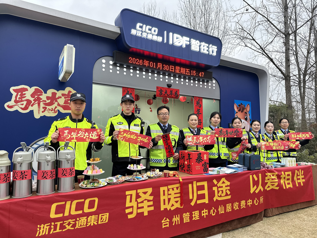 暖意先行,护航不止。仙居收费中心所同步在仙居收费站外广场,正式启动“驿暖归途,以爱相伴”春运暖心服务活动,为返乡司乘送上新春暖意。走进活动现场,浓厚的新春气息扑面而来,马年充气吉祥物萌趣吸睛,打卡点指示牌清晰醒目,智在亭挂满红灯笼、红对联,主题横幅迎风展扬,处处洋溢着喜庆祥和的年味,让司乘一到站就感受到家的温暖。