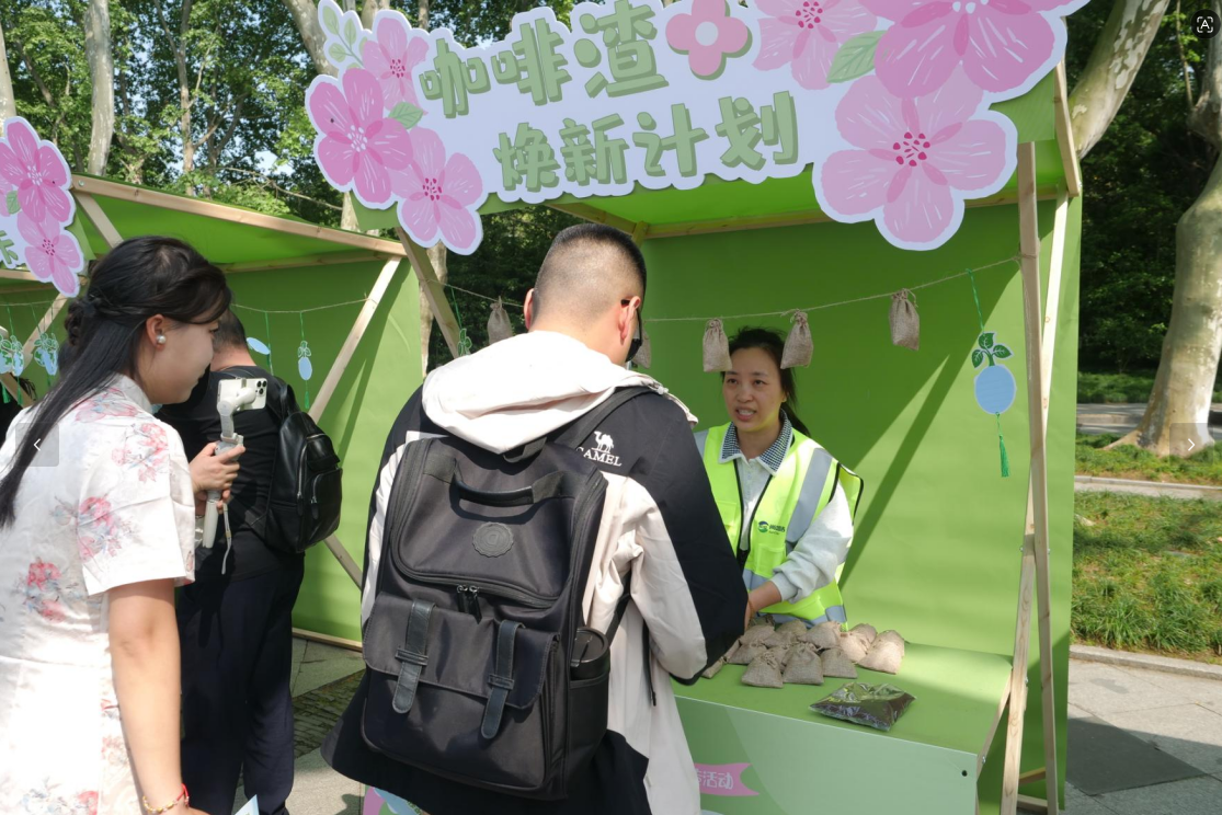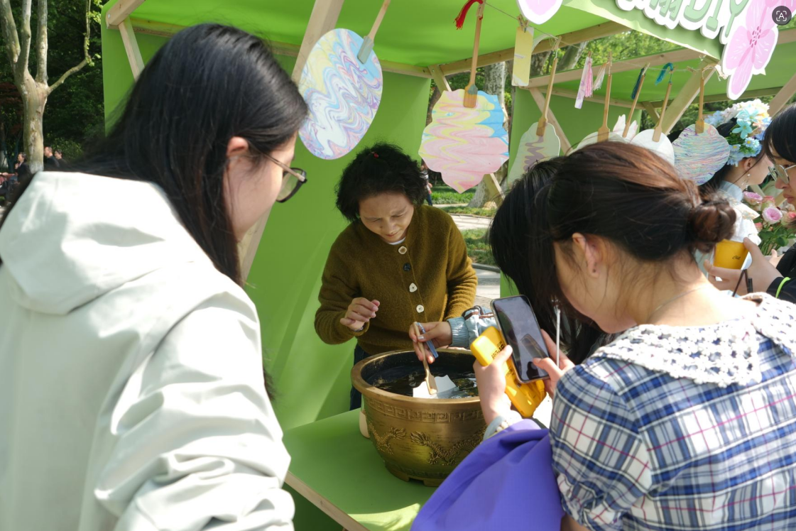 下午2时30分,游园会在柳浪闻莺景区的春色中正式开启。活动现场设有10个主题摊位,涵盖资源再生、非遗体验、游戏互动、志愿服务等多个板块,兼具知识性、趣味性与艺术性。“咖啡渣·焕新计划”摊位前,游客可免费领取用咖啡渣制成的环保除味包,感受“变废为宝”的绿色价值;“柠香分类·春日驿站”贴心发放柠檬水,引导游客在饮用后规范投放杯具,让环保习惯融入点滴日常;“废塑再造·春风工坊”与“花韵留春·漆扇DIY”则成为手工爱好者的聚集地,干花书签、非遗漂漆扇等手作体验让游客在创作中感受环保美学,游客参与热情高涨,摊位前一度排起长队。