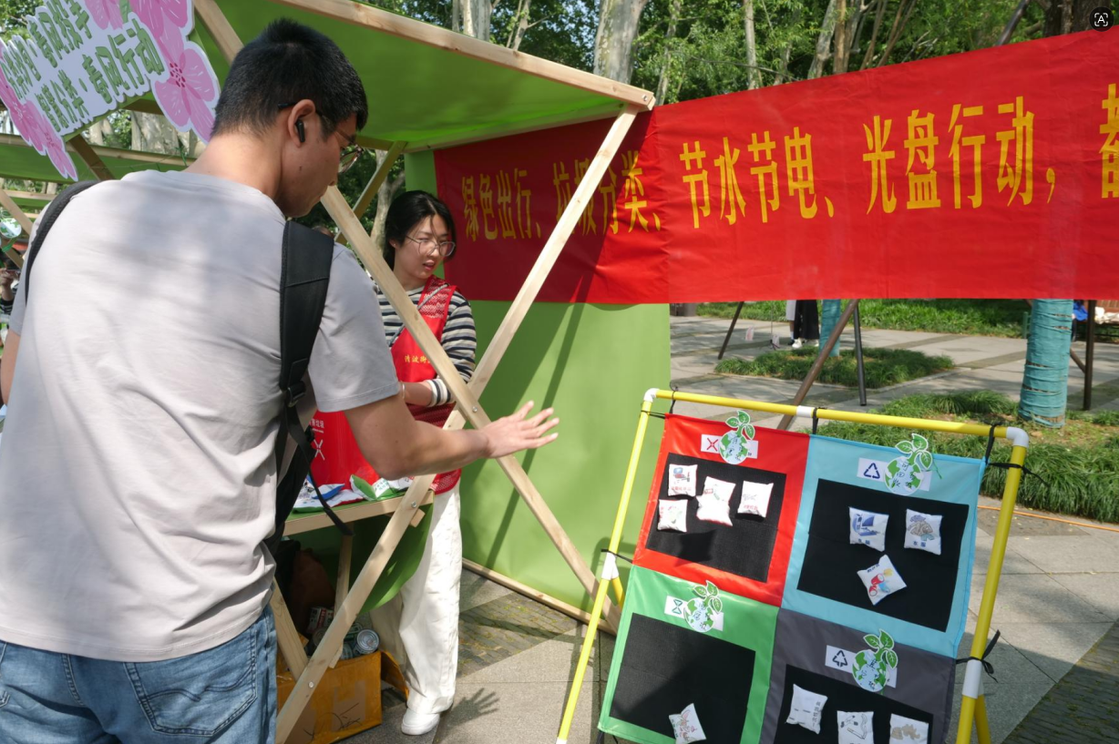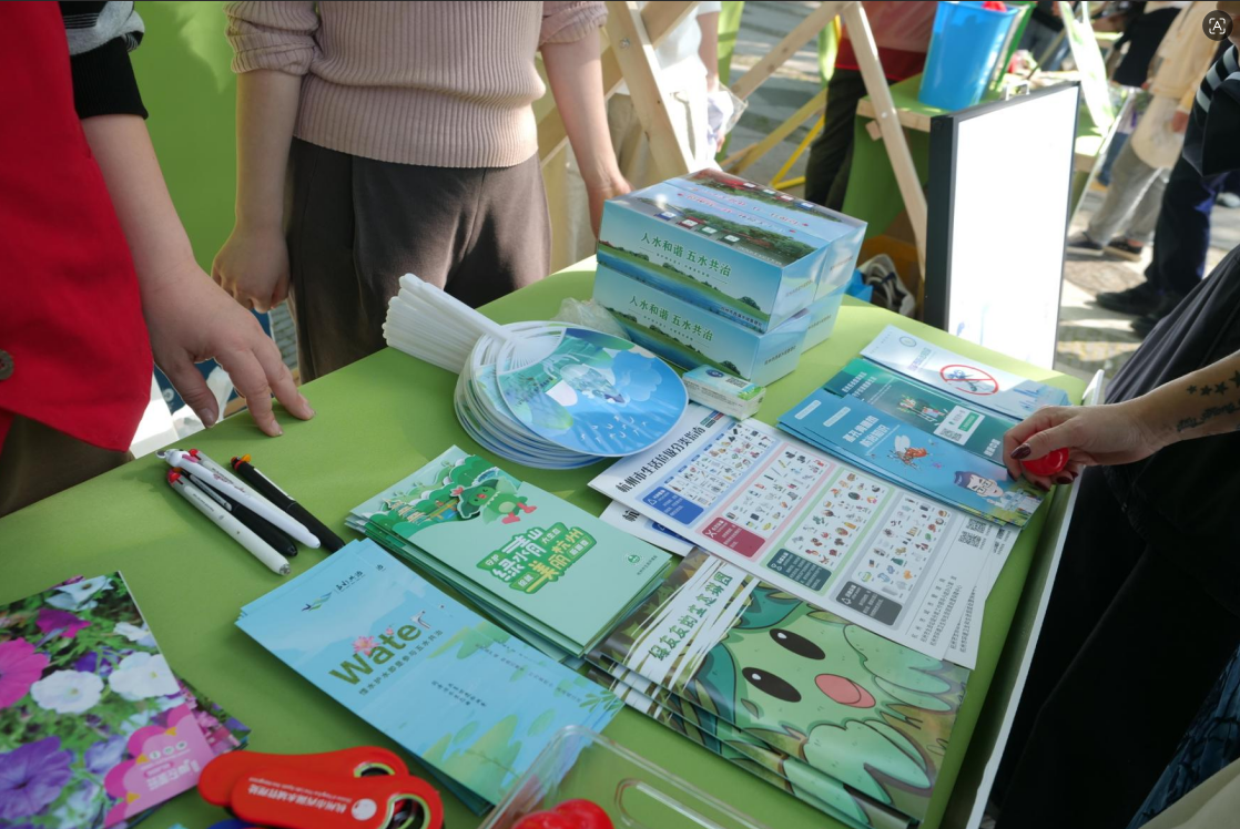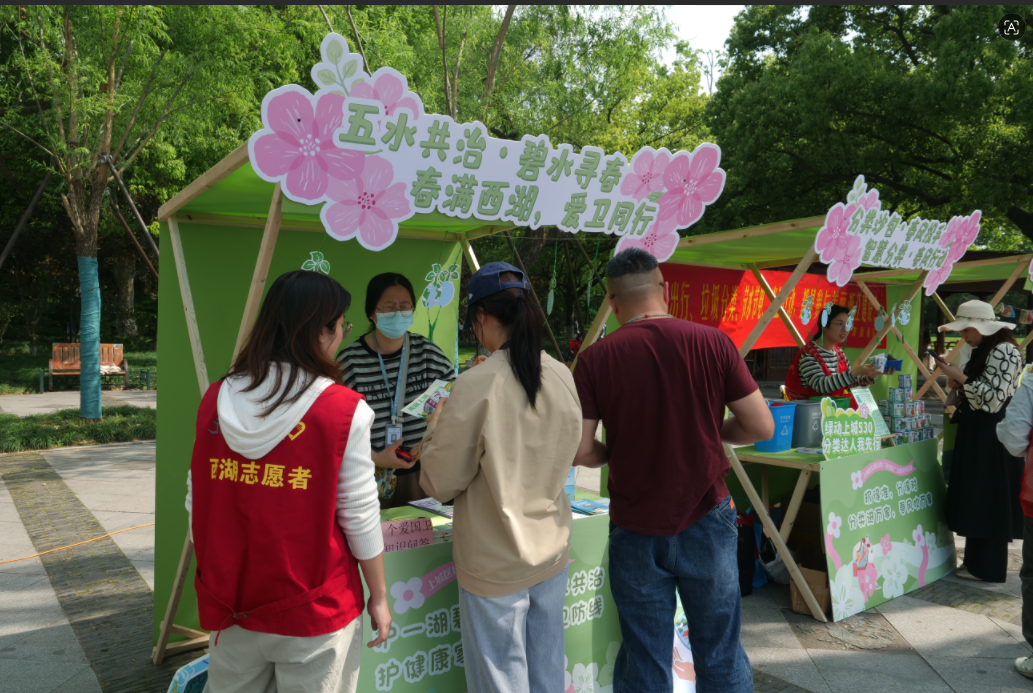 在知识互动区,“分类沙包·春风投手”摊位设置了四色分类桶,游客领取印有不同垃圾图案的软质沙包进行投掷挑战,投中即可兑换环保小礼品,现场参与感十足。由景区联合设立的“五水共治·碧水寻春”摊位,以西湖水质保护为切入点,生动解读治污水、防洪水、排涝水、保供水、抓节水五大行动。“点亮绿色星球·手工DIY”摊位前,游客手绘星球灯,点亮“循环之光”,将环保理念融入指尖艺术。