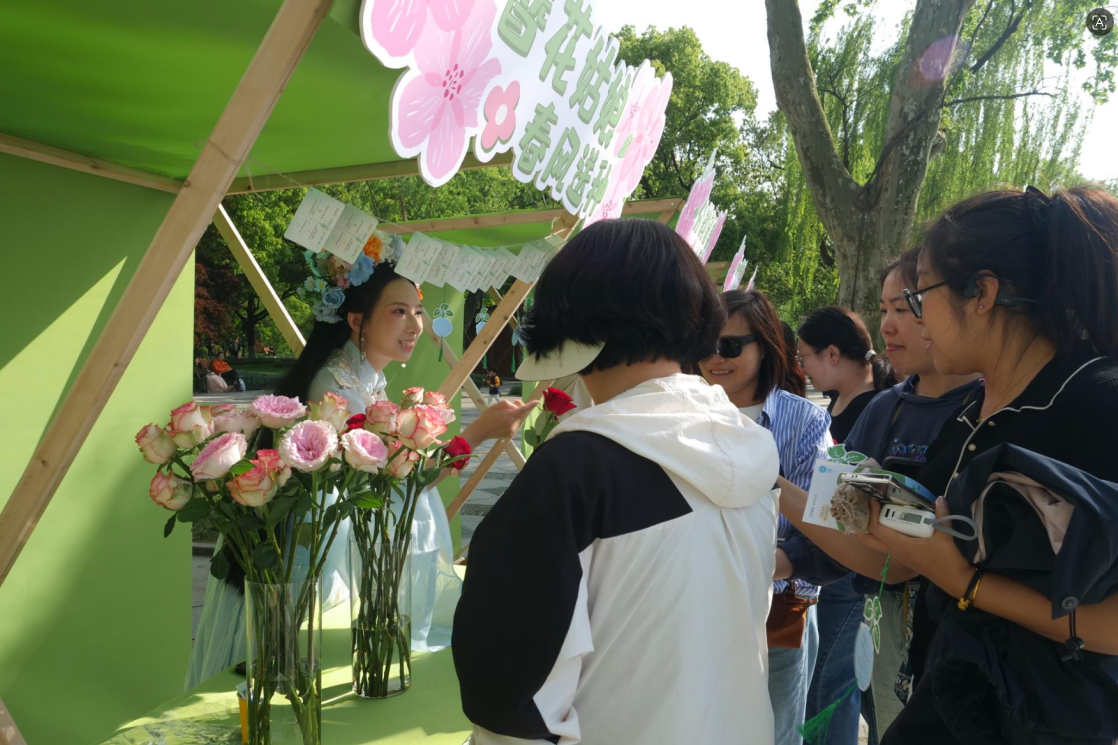 “簪花姑娘·春风送种”摊位尤其受到游客喜爱,工作人员身着宋韵“簪花姑娘”服饰穿梭于景区,游客回答一道垃圾分类小问题即可领取鲜花种子卡片,还可通过投放塑料瓶兑换花种。“以旧换绿”回收站同步开放,游客携带塑料瓶、纸箱等可回收物可兑换小型绿植,两项活动以绿意回馈分类善行,当天累计兑换花种卡片逾200份、绿植近百盆。