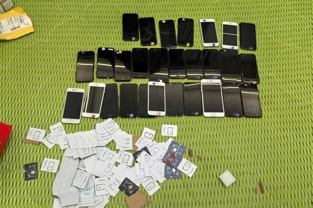 ▲公安机关从犯罪嫌疑人处搜查出的近30部手机及上百张电话卡。