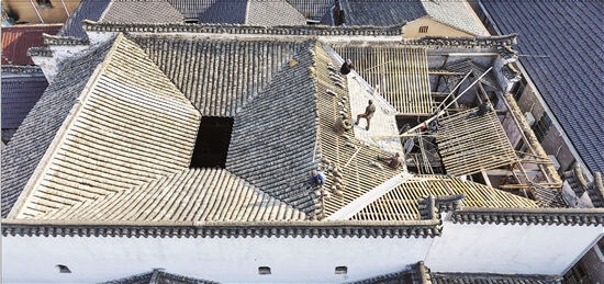 12月10日,在建德市寿昌镇蒋宅古建筑修缮工程现场,工人正在对木梁、瓦片等破损老化的古建筑设施进行修缮。