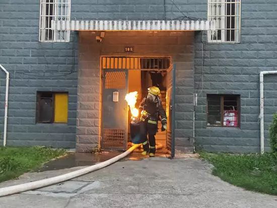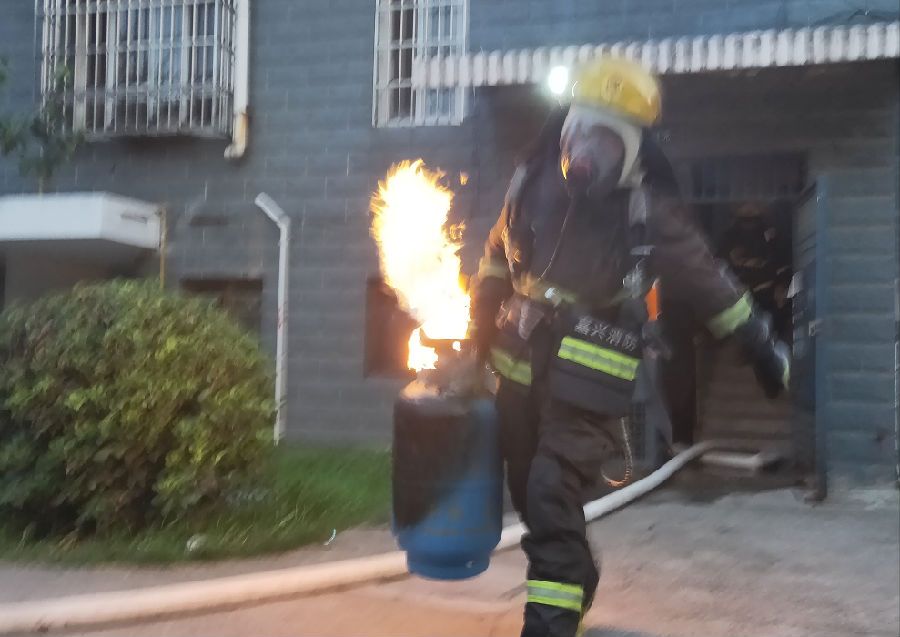 “我马上把罐子抱下去!”危急时刻,消防员郭孟宇主动请缨,并佩戴好手套,用水枪打湿战斗服,冲入厨房,拎起正冒着火焰的煤气罐就往屋外楼下跑。