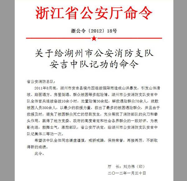 2012年 安吉中队抗在洪救灾表现突出荣立集体二等功