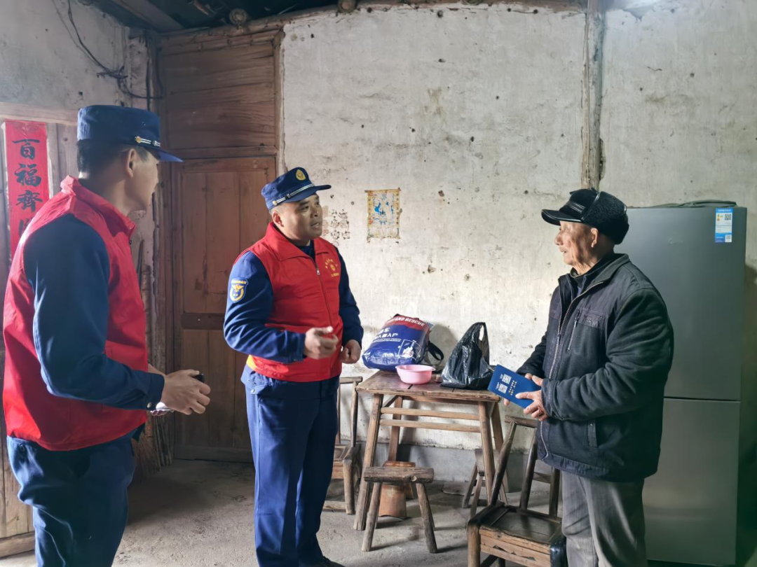 农村独居老人是重点关注对象。在走访孤寡老人家中时,蔡文军看到老人正用炭火取暖,立即叮嘱:“大爷,烤火一定要开窗,睡前务必把火灭了,一氧化碳中毒可不是小事!”团队还检查了老人家中的电器线路,更换了老化的插座。