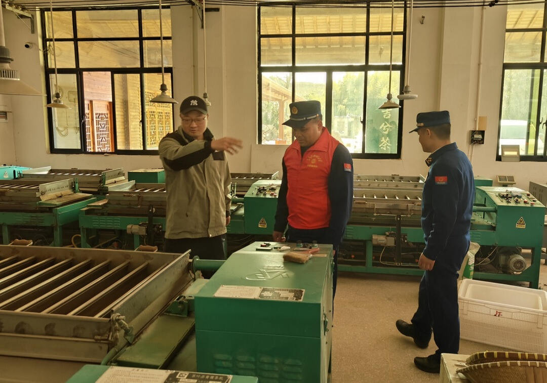 “滚筒炒茶机的燃气管道接口要定期检查,建议加装自动切断阀。”在炒茶车间,蔡文军盯着滚筒炒茶机的管线接口,向企业负责人强调,“炒制区温度高,茶青、柴草这些可燃物必须放够1.5米远。”针对疏散通道堆放茶青、电气线路未穿管等问题,团队当场指导整改。