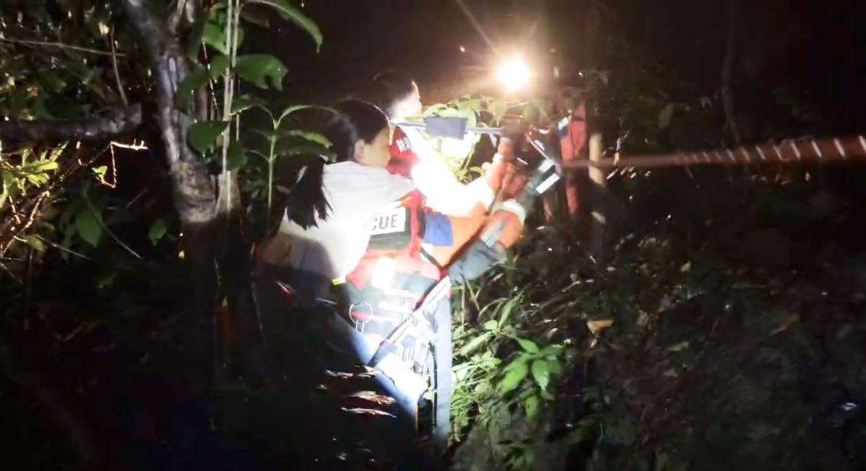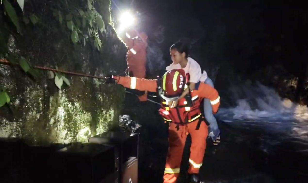 在实施营救过程中,救援人员全程做好安全防护,引导被困游客依次通过绳索通道有序下山:成年游客手扶绳索稳步撤离,两名年幼的孩子则由消防员全程怀抱护送,确保每一步转移都安全可控。现场救援人员密切配合,通过“接力传递”的方式,精准应对水流冲击和湿滑路面带来的挑战。