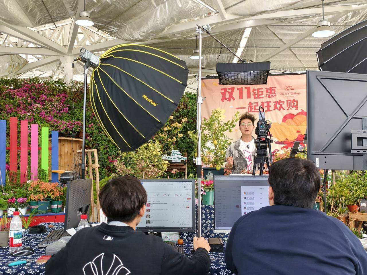 “双十一”当天,采访团来到桃园村的塔莎园艺同心共富花园,花农打理花圃,主播线上卖花,包装员忙着打包发货,大棚里一派忙碌景象。