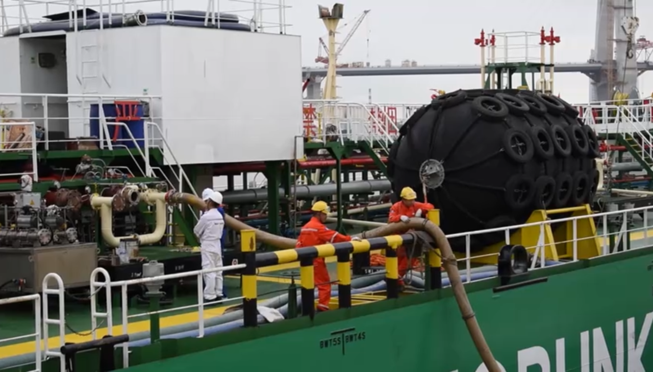 4月22日,在宁波舟山港梅山港区,加注船为即将远航的国际航行船舶缓缓注入燃料,浙江省内首次“船对船”保税绿色甲醇燃料加注业务正式落地。