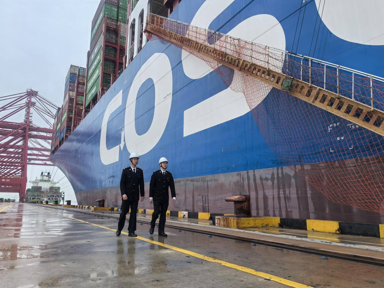 宁波海关所属梅山海关关员对“中远海运天秤座”轮开展船边监管。储星星 摄