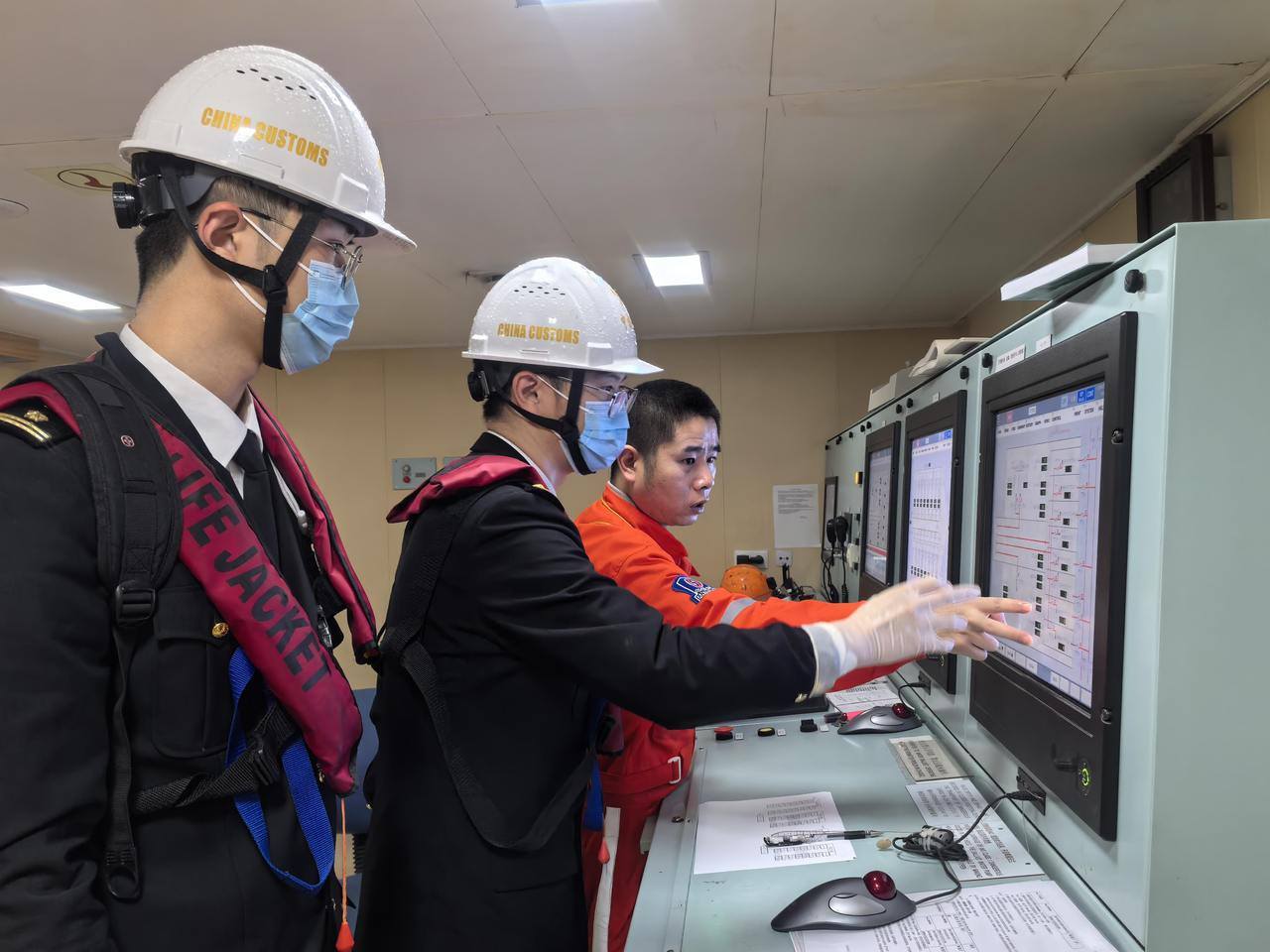 宁波海关所属梅山海关关员于“中远海运天秤座”轮核对油舱舱容数据。储星星 摄