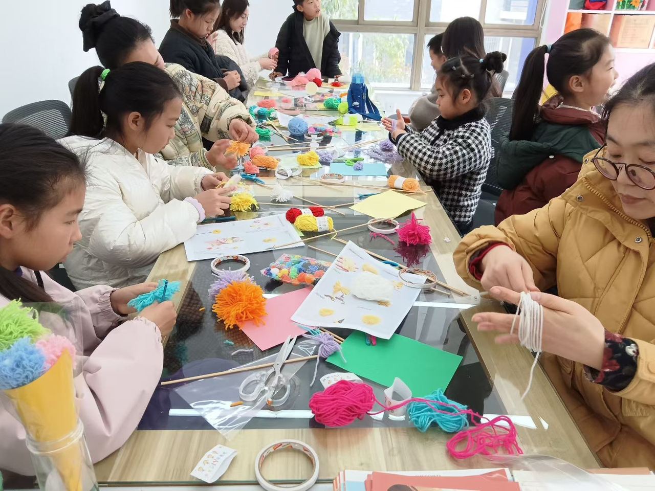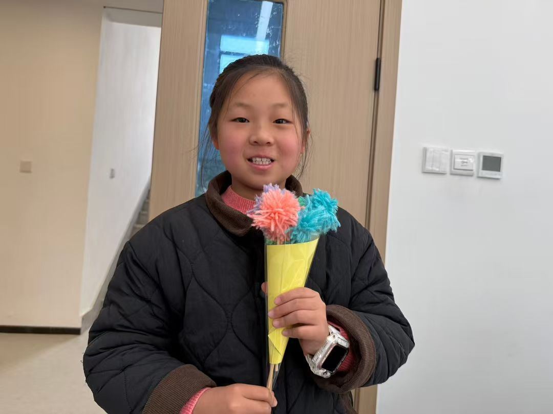 活动现场,工作人员提前精心筹备,备齐了彩色毛线、彩色卡纸、彩带、剪刀等全套制作物料。活动过程中,工作人员全程耐心为孩子们讲解示范毛线花的制作步骤与技巧,从花瓣的缠绕塑形、花杆的固定包裹,到整体造型的搭配、花束的精美包装,一步步手把手引导孩子们完成创作。孩子们全神贯注投入制作,将奇思妙想与满满心意细细编织进每一片花瓣、每一束花团之中,现场氛围轻松融洽。制作完成后,孩子们纷纷展示自己独一无二的手工作品,互相分享创作心得,脸上洋溢着满满的成就感与幸福感。