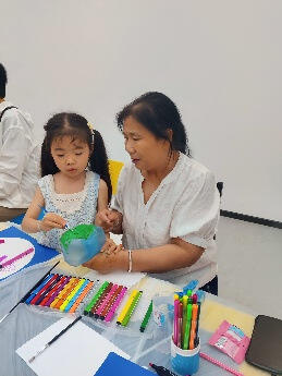 活动现场,工作人员化身创意导师,带领孩子们开启奇妙的环保艺术之旅。孩子们拿起画笔,寥寥几笔便勾勒出粉色荷花瓣的柔美轮廓;接着,大家将废弃垃圾袋变废为宝,在鼓起的袋身蘸满绿色颜料,轻轻按压在画纸上 —— 一片片栩栩如生的荷叶便跃然眼前。