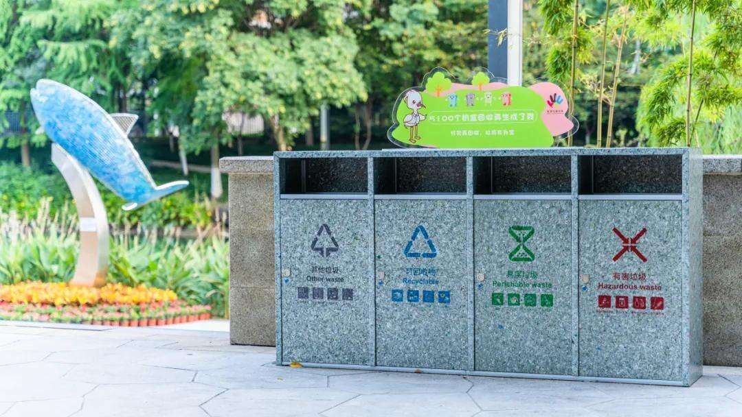 ▲盈丰垃圾分类体验馆体外的公园内,设有各类废品回收利用制作而成的垃圾桶