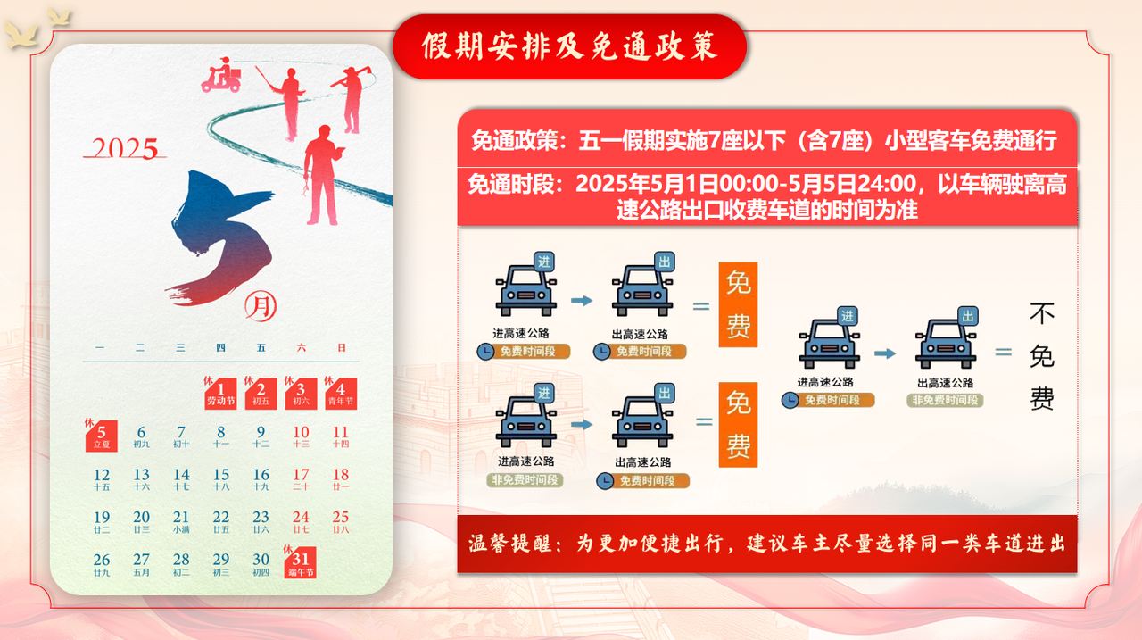五一期间高速公路7座以下(含7座)小型客车免费通行,免通时段为2025年5月1日0时至5月5日24时(以车辆驶离出口收费站时间为准)。