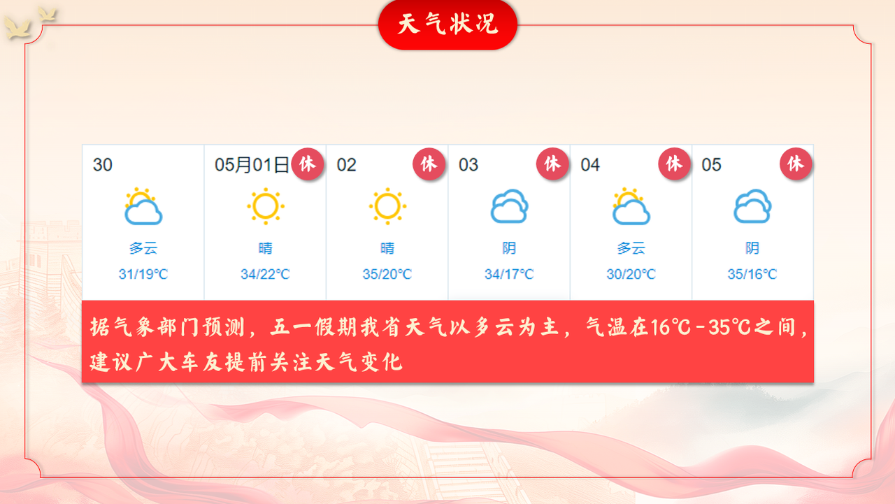 五一期间,返乡探亲、外出游玩的人流、车流将大幅度增加。广大司乘朋友出行前请及时对车辆进行安全检查,并及时了解天气状况和道路通行情况,合理安排时间、路线。