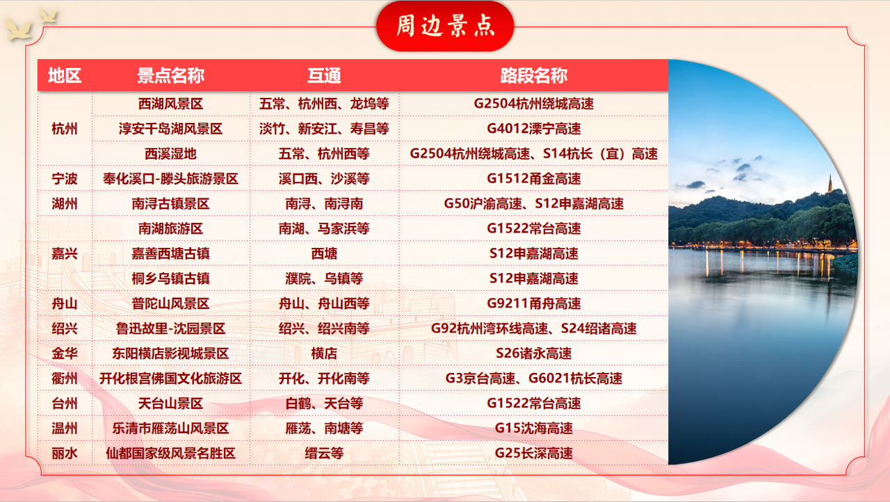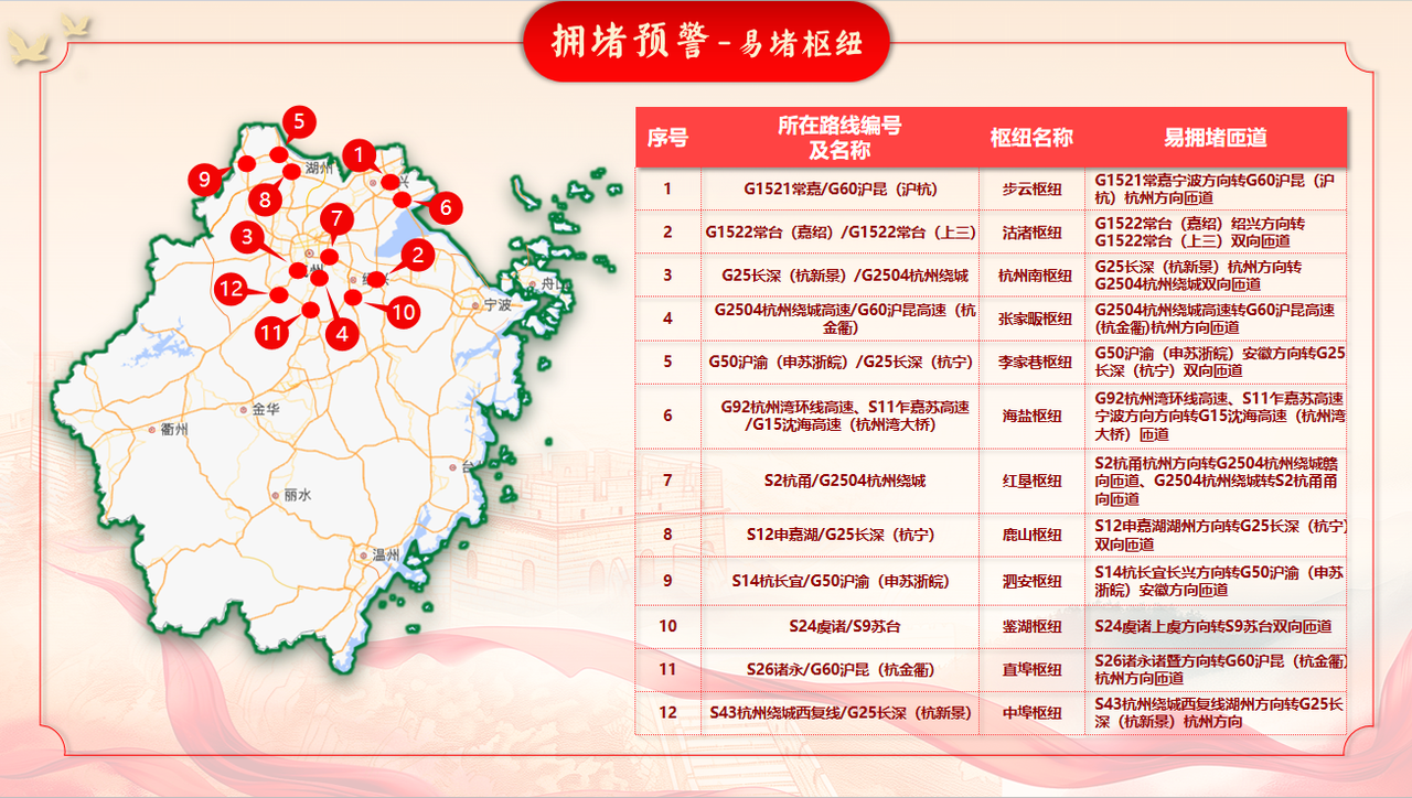 南太湖、横店、沿江等易受地方道路倒灌影响及部分热门景区附近收费站易发拥堵。