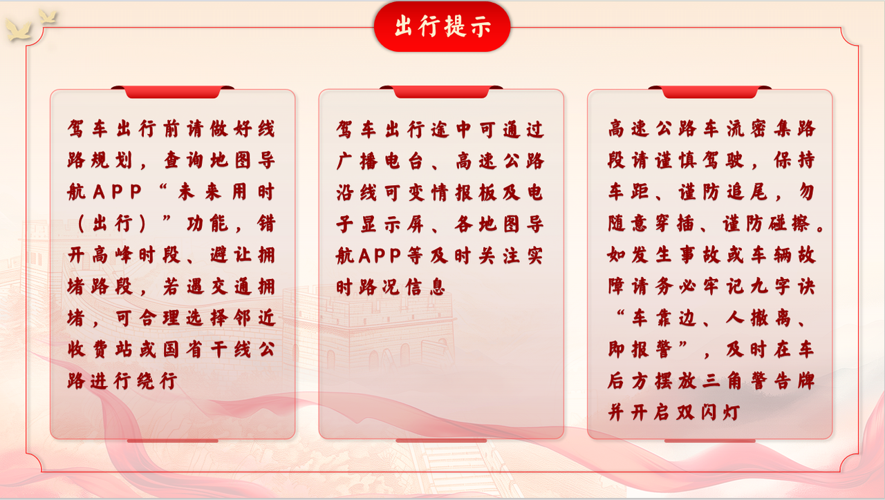 高速出行途中,请注意文明驾驶,遵守交通规则,注意控制车辆速度,严禁违规停车和占用应急车道。如遇交通拥堵,请有序排队,注意控制行车间距,切勿争道抢行、强行变道,严禁疲劳驾驶、分心驾驶,拒绝酒驾等各类交通违法行为。