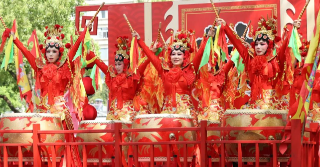 “咚咚咚”,当天下午,伴随着激昂的鼓声,身披穆桂英挂帅戏服的女子们英姿飒爽地齐敲中国鼓,热热闹闹地拉开乐清非遗巡游的序幕。