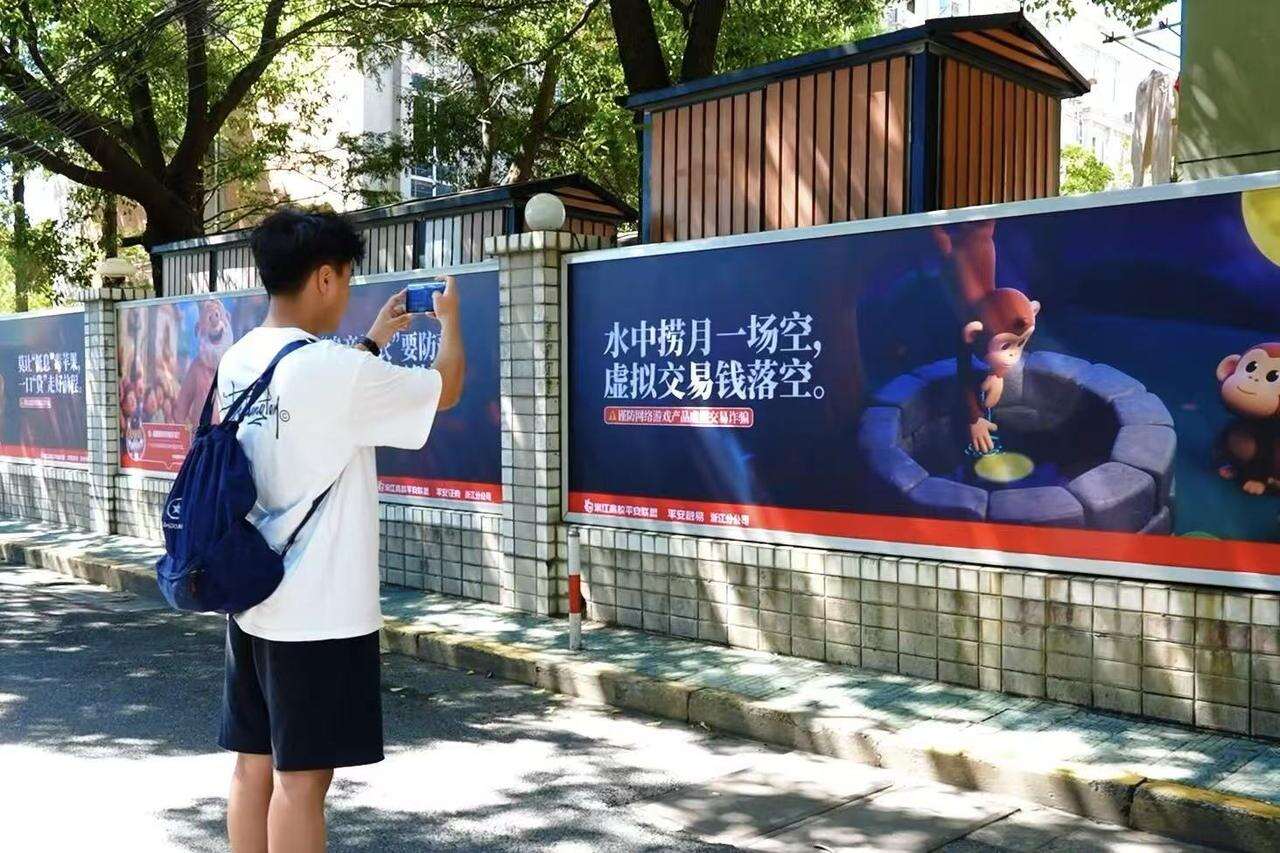 同步揭牌的“平安街”反诈文化街区,通过多元化的展示载体和互动设计,成为杭州首个集教育性、趣味性、实用性于一体的校园反诈宣传实体阵地。街区创新采用“文化+科技”的展示手法,巧妙融合经典童话、神话故事与反诈主题。例如,在包拯断案场景旁配文“真的包公在衙门里,假的'公检法'在电话里”,通过古今对比生动揭示冒充公检法诈骗的特征。街区共呈现20个大学生高频受害诈骗关键词,每个展示点均设有“平安义警考考你”互动问答区,让学生在趣味互动中加深记忆。此外,活动还引入Cosplay创意大赛、反诈情景剧等Z世代喜闻乐见的形式,让反诈知识在轻松氛围中“活”起来。