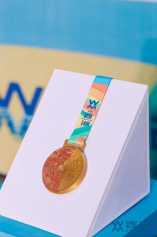 今年“西湖半马”的奖牌设计可谓下足功夫,奖牌正面左右对仗,一边是精雕细琢的21.0975公里路线图,西湖八大名胜依次镶嵌;另一侧则取形杭州折扇,扇面之间皆是江南雅韵与风尚。翻到背面,“三潭映月”“柳浪闻莺”惊艳亮相,凑齐完整“西湖十景”,寓意“十全十美”。当跑者跑完全程,拿到的不只是一块奖牌,而是一整个西湖的诗意缩影。