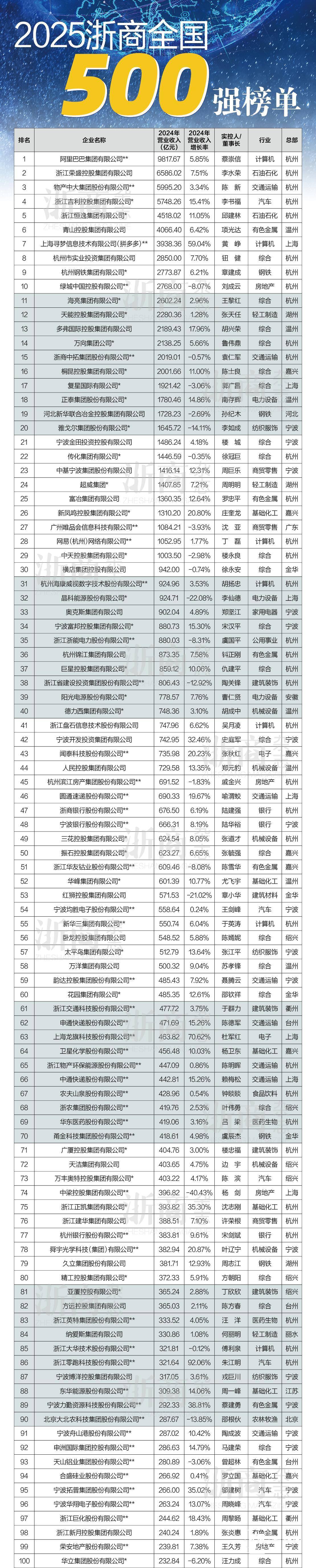 “2025浙商全国500强”榜单根据国际、国内通行规则,按照企业销售(营业)收入大小排序,销售(营业)收入为企业整体(包括各子公司)销售收入;对于以美元、港元等为单位公布业绩的企业,《浙商》杂志根据2024年人民币平均汇率进行折算;有些企业以公布的财年数据计算。