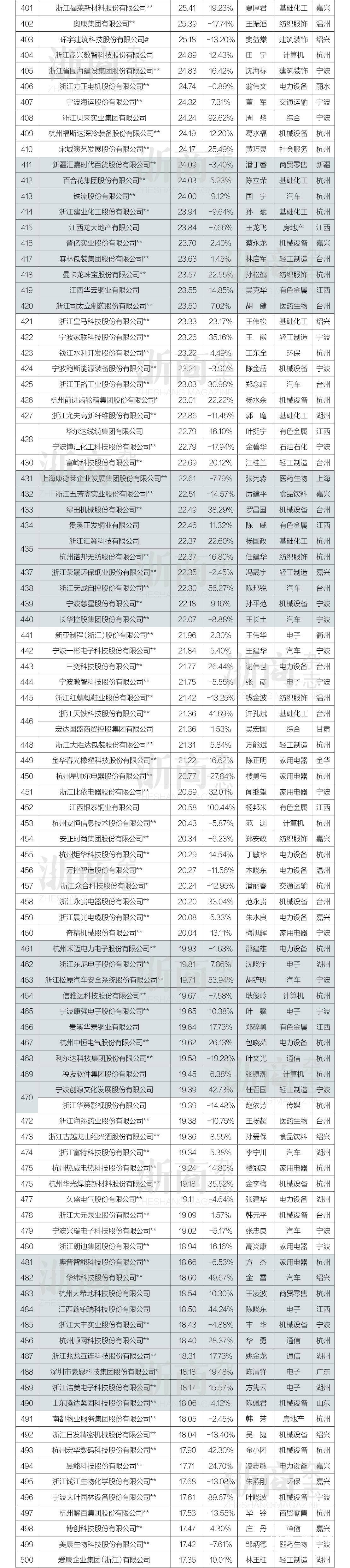 由于榜单包含大量上市公司,《浙商》杂志对入榜企业统一按照2021版“申银万国行业分类标准”进行分类,申万行业完整如:机械设备(一级行业)—自动化设备(二级行业)—机器人(三级行业),《浙商》杂志500强主榜单为统计方便统一使用了一级行业分类,包括农林牧渔、基础化工、钢铁、有色金属、电子、汽车、家用电器、食品饮料、纺织服饰、轻工制造、医药生物、公用事业、交通运输、房地产、商贸零售、社会服务、银行、非银金融等31个子类。
