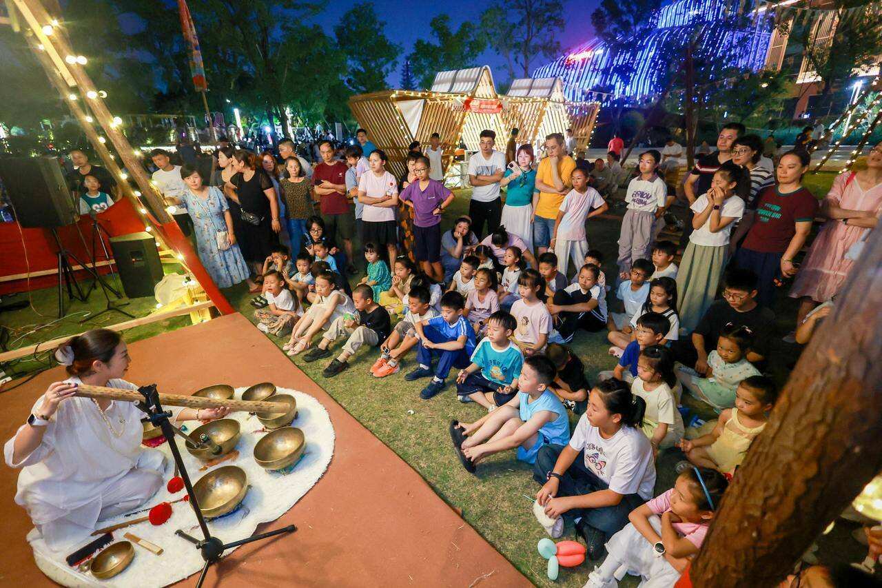 夜色渐深,秋老虎被江风“驯服”了几分。一场即兴音乐会在市集一角悄然上演。在打击乐手旭阳钢舌鼓空灵、纯净、悠扬的音乐中,就连最顽皮的小朋友都被音乐吸引了。游客们或坐或站,跟随音乐,享受着城市难得的宁静。