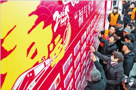 春运首日,在杭州火车东站、西站、城站及杭州萧山国际机场内,早已装扮一新,浓墨重彩的农民画、琳琅满目的非遗展陈、欢腾的歌舞快闪,陪伴着每一位远行归家的游子,写春联、送年画等保留节目以及机器人、机器狗跳舞欢庆的场面扑面而来。