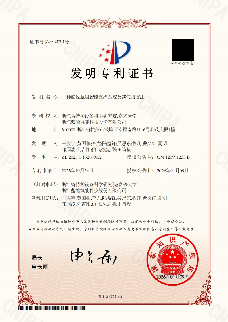 近日,省特科院牵头申报的《一种储氢瓶组智能支撑系统及其使用方法》获国家知识产权局发明专利授权。