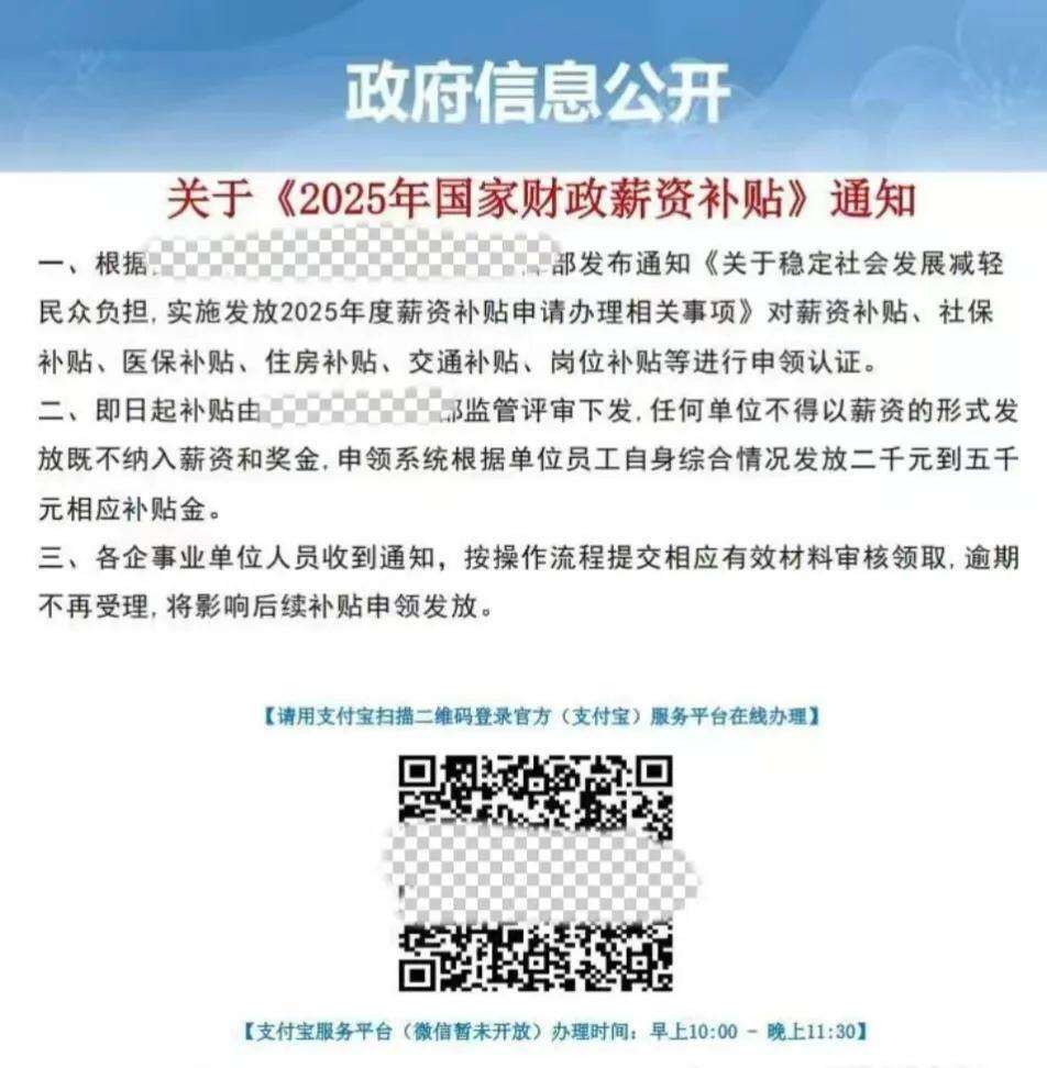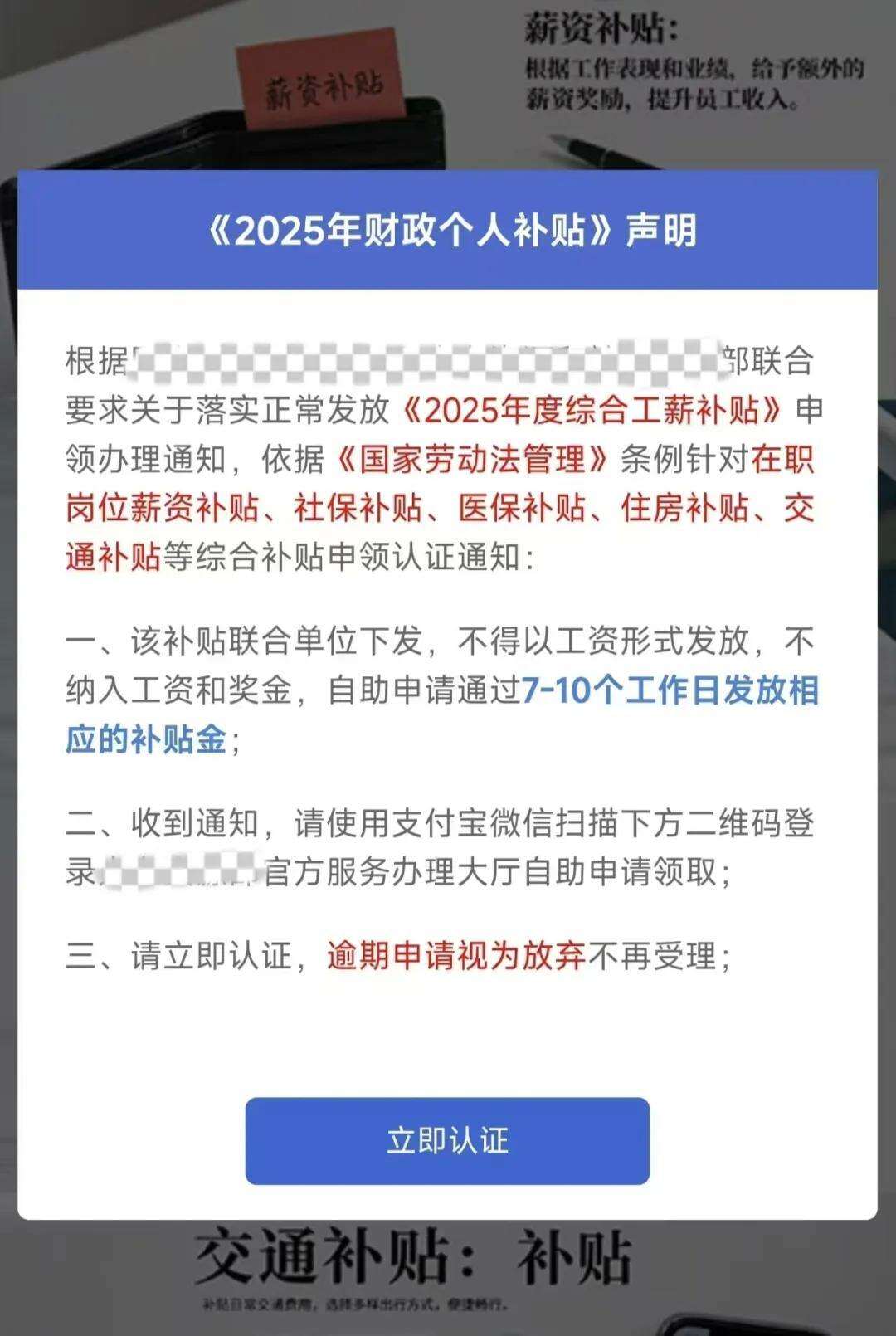 前两天,李先生在公司群里看到,同事发布了一条“2025年国家薪资补贴通知”的消息,消息称:“国家相关部门对薪资补贴、社保补贴、医保补贴、住房补贴、交通补贴等进行申领认证。申领系统根据单位员工自身综合情况发放2000元到5000元补贴金。单位员工需按操作流程提交相应有效材料经审核后领取,逾期不再受理,还将影响后续补贴申领发放。”