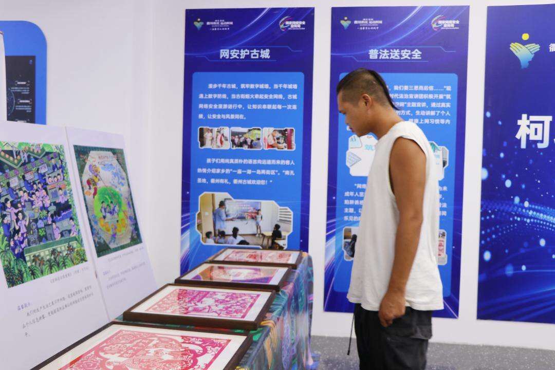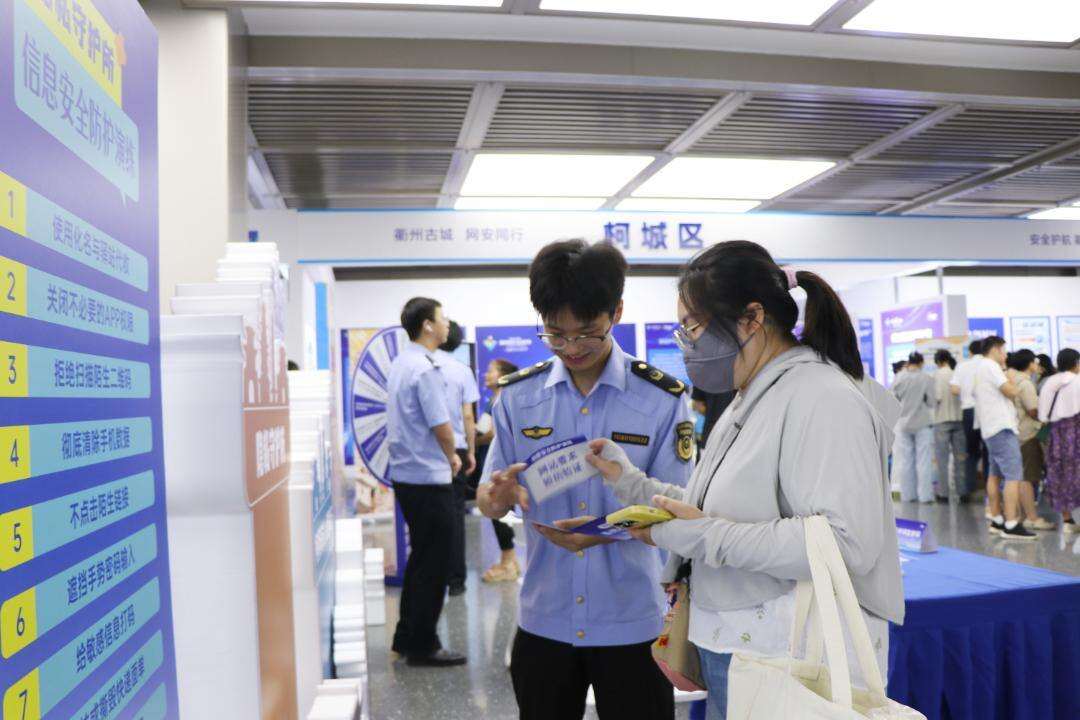 网络安全知识互动问答、网络安全主题农民画展和非遗剪纸展……在以“非遗+科技”为特色的柯城区网络安全宣传展区,融合了常见网络安全问题和传统艺术形式的农民画和剪纸作品,以及柯城区典型网络安全治理措施、成果的展览让人目不暇接。市民们手持集章卡片,在反诈演练场、安全瞭望台、AI迷雾站等6个“网安打卡区”参与打卡游戏,增长网络安全知识。