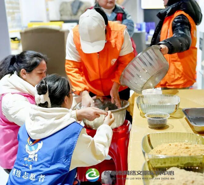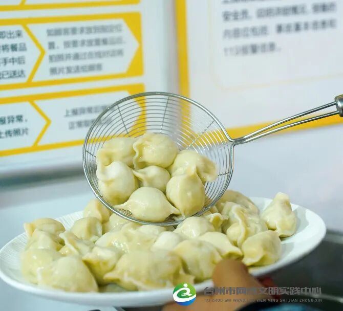 活动现场,台州市网络文明实践中心志愿者和社区工作人员们正忙得热火朝天。大家分工有序,揉面、擀皮、调馅、蒸煮……每个环节都流畅而默契。热气腾腾的香气弥漫在整个场地,提前为奔波了一天的外卖员们,酝酿出满溢的关怀与暖意。