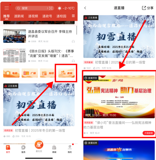 打开APP首页或者“遂直播”