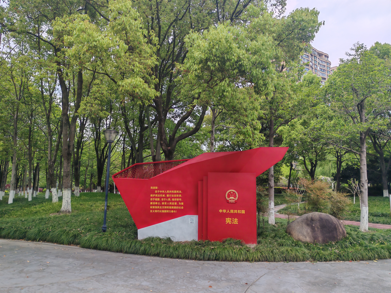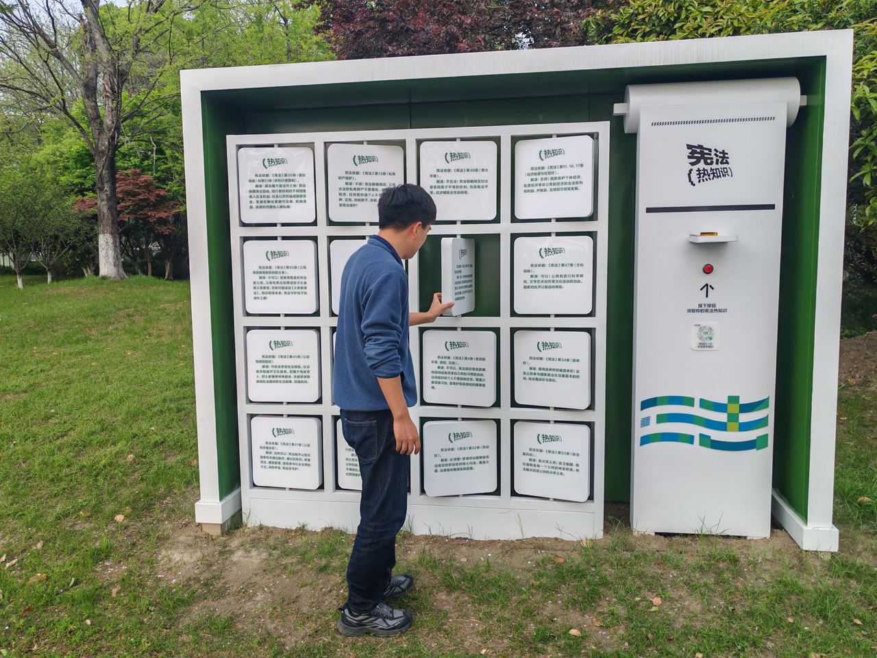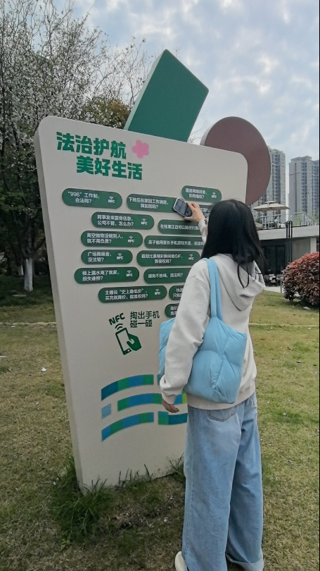 在这片法治风景中,隐藏着许多有趣的互动玩法。江南第一码头的宪法热知识互动装置深受小朋友喜爱,只要按下按钮,设备就会吐出宪法能量卡牌,“孩子必须上学是宪法规定”“朋友圈不是法外之地”等热知识在趣味互动中深入人心。在柳岸驿广场,奶茶造型的NFC法治案例墙,只要用手机碰一碰,就能查看网络诽谤、职场维权等高频民生案例的法律解读。坐在法治景观座椅上,你还可以聆听一段法治故事,或解一解座椅装饰上的法治谜题。
