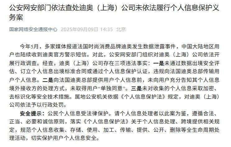 迪奥发生数据泄露事件,公安网安部门:予以行政处罚