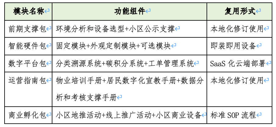 5.两网融合回收(绿色引擎):在生活垃圾统一收集的基础上,配置“前端统收,后端细分,居民直接变现”的再生资源回收体系。小区内结合收集点配置“统收变现”数字化回收设备;中端结合设备的预警,进行数字调控的收运;后端以镇街为单位建设标准化分拣中心,最大限度降低政府支出,推动再生资源回收产业升级发展。