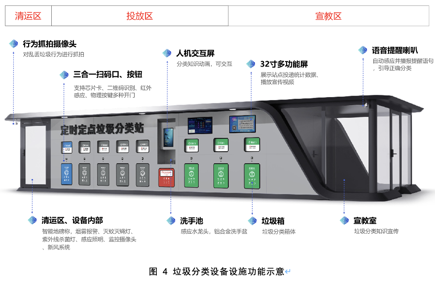 垃圾分类设备设施包括清运区、投放区、宣教区,清运区和投放区配备有行为抓拍摄像头、三合一扫码口、智能地磅秤等,宣教区配有人机交互屏、多功能屏、语音提醒喇叭、宣教室等,可根据项目场地情况和需求选配不同型号产品。