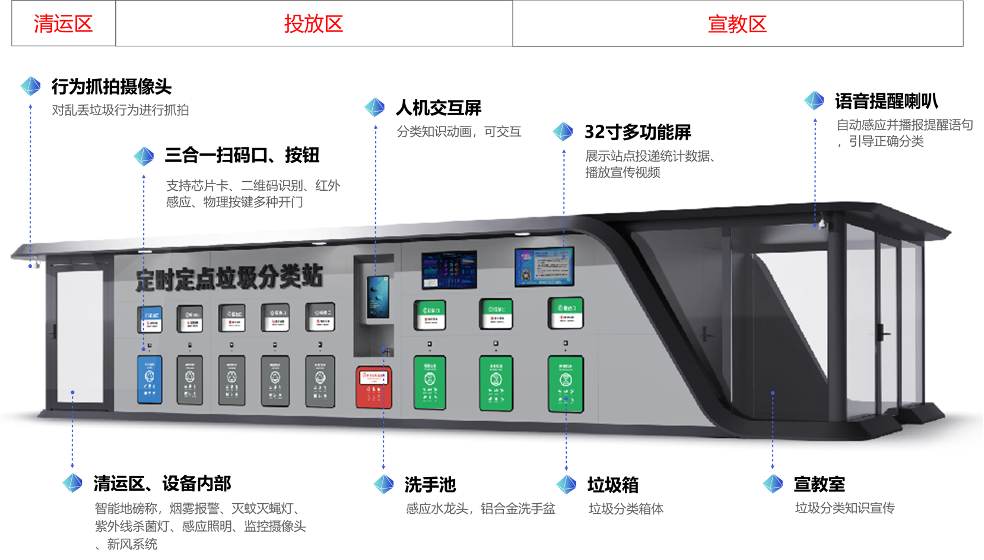 垃圾分类设备设施包括清运区、投放区、宣教区,清运区和投放区配备有行为抓拍摄像头、三合一扫码口、智能地磅秤等,宣教区配有人机交互屏、语音提醒喇叭等,可根据项目场地情况和需求选配不同型号产品。