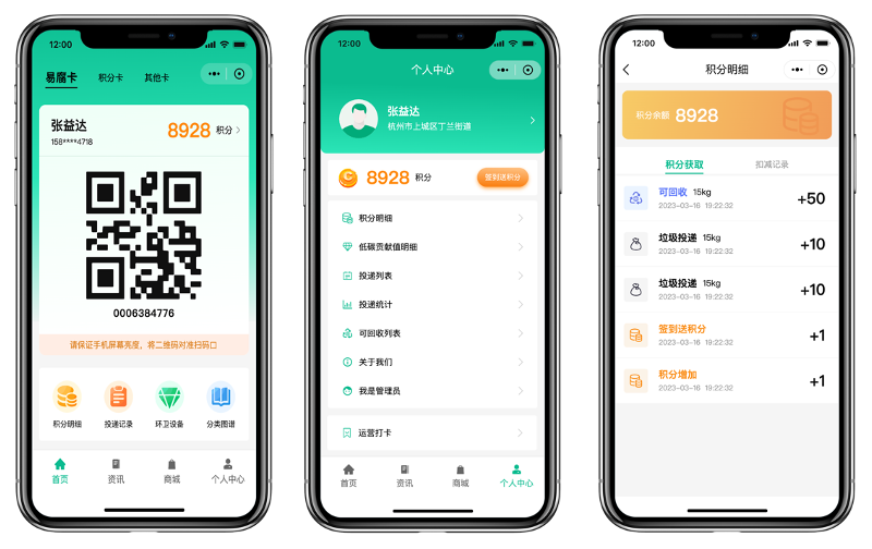 采用人脸识别、刷卡、二维码扫码三合一身份识别模式,自动把投递行为和用户绑定,根据垃圾分类准确率、可回收垃圾数量等数据,自动生成用户的碳积分,积分可以抵扣物业费,也可以在用户端小程序积分商城兑换物品,提高居民垃圾分类的积极性。